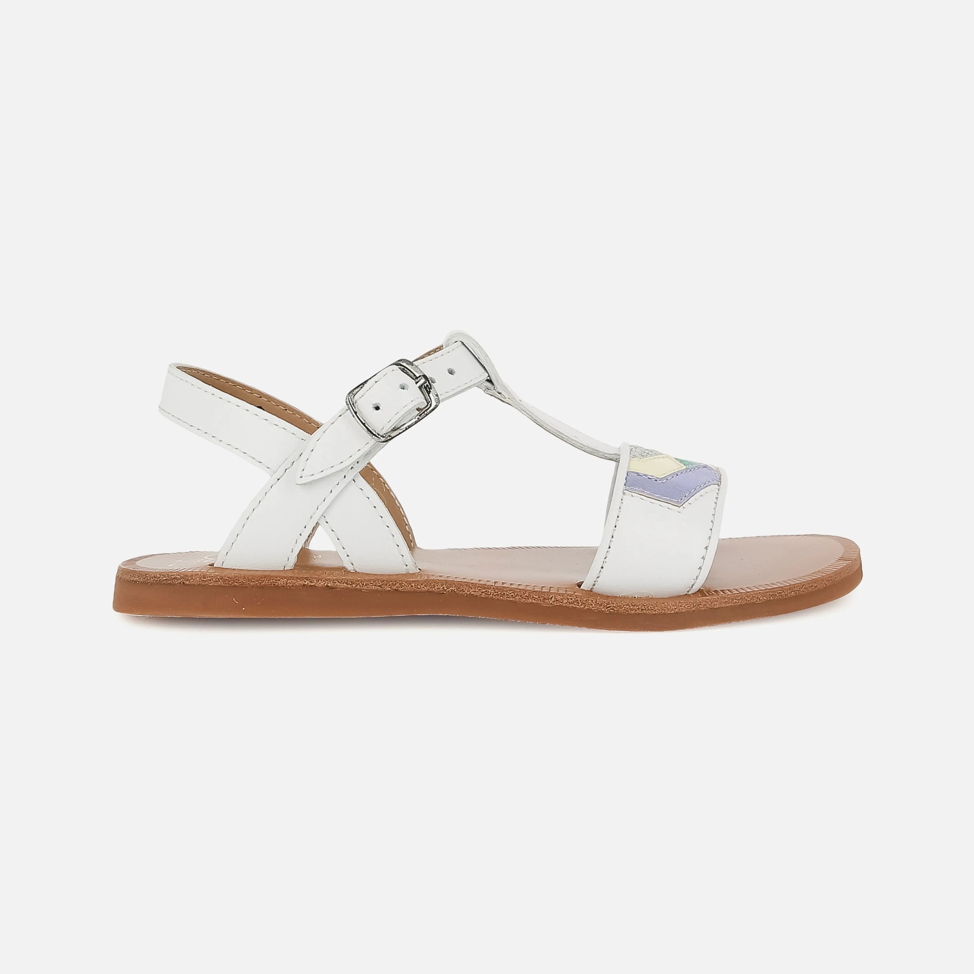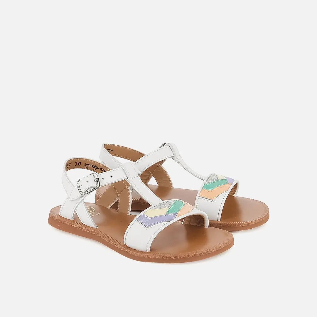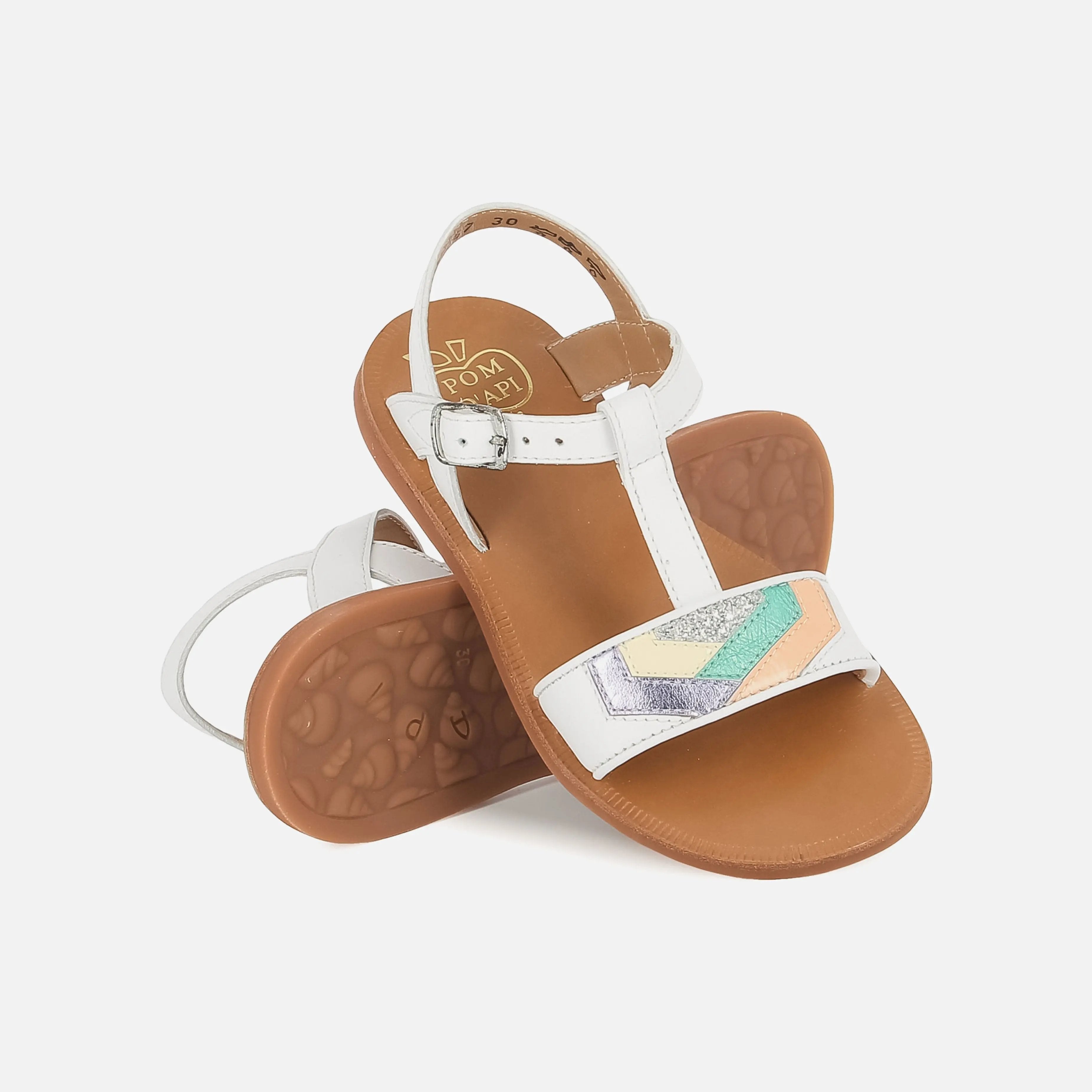 Cette sandale pour enfants est présentée dans une version en cuir lisse blanc, avec une bride multicouleurs. Cette chaussure souple et légère est conçue avec des matériaux de qualité pour le bon développement du pied. Elle s'ajuste facilement à la cheville grâce à sa boucle réglable.