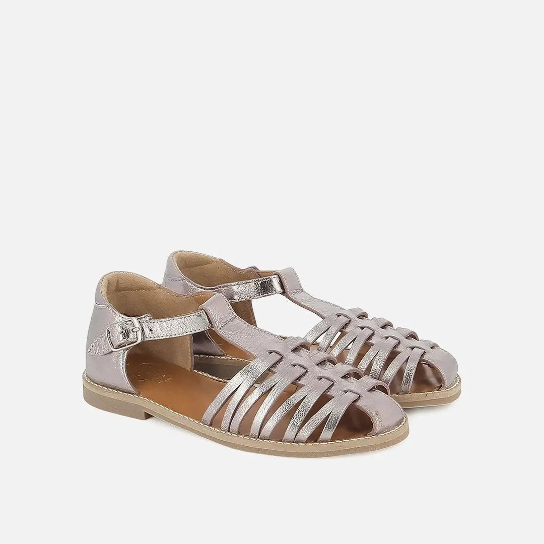 Cette sandale à brides entremêlées pour enfants est présentée dans une version en cuir métallisé violet. Cette chaussure souple et légère est conçue avec des matériaux de qualité pour le bon développement du pied. Elle s'ajuste facilement à la cheville grâce à sa boucle réglable.
