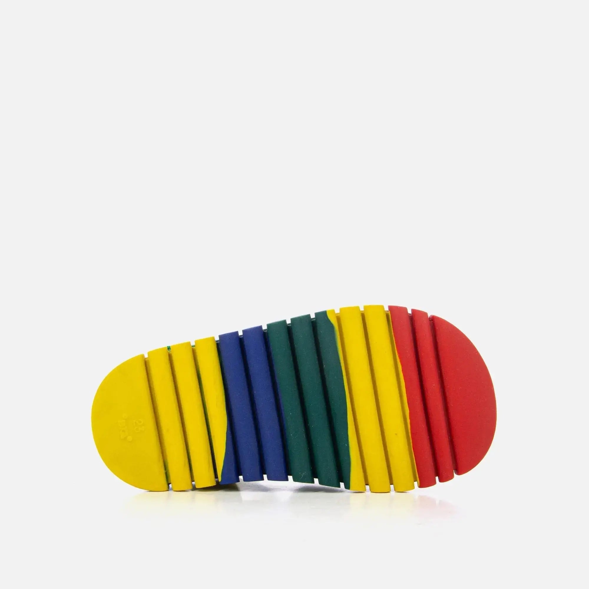 Diese Sandale für Kinder wird hier in einer Version aus grünem Leder mit einer mehrfarbigen Sohle im Rollerskate-Stil präsentiert. Dieser Schuh wurde mit hochwertigen Materialien für die richtige Entwicklung des Fußes entworfen. Er lässt sich dank der verstellbaren Schnalle leicht an den Knöchel anpassen.