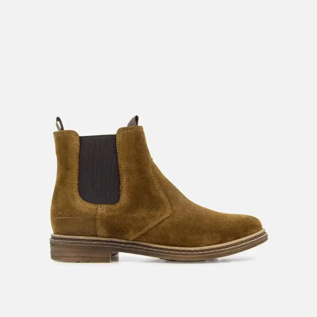 Diese Stiefelette für Kinder kommt in einer Version aus braunem Veloursleder mit einem schwarzen Gummizug. Sie ist leicht und geschmeidig und wurde aus hochwertigen Materialien gefertigt. Der Schuh hat einen hohen Schaft, um Knöchel und Rist optimal zu stützen, und ist dank des innenliegenden Reißverschlusses und des Gummizugs leicht anzuziehen.