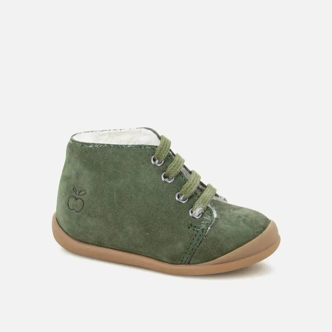 Dieser Erstlingsschuh mit Schnürsenkeln für Kinder kommt in einer Version aus olivgrünem Veloursleder mit synthetischem Innenfutter. Der Schuh ist leicht und hat eine Gummisohle. Er wurde aus hochwertigen Materialien gefertigt, die eine gesunde Entwicklung des Fußes fördern. Eine Anti-Twist-Verstärkung im hinteren Teil des Schuhs sorgt für optimalen Halt und Stabilität und bietet gleichzeitig Flexibilität im Vorfußbereich. An der Vorderseite des Schuhs wurde eine Haube angebracht, um den Schuh zu schützen.