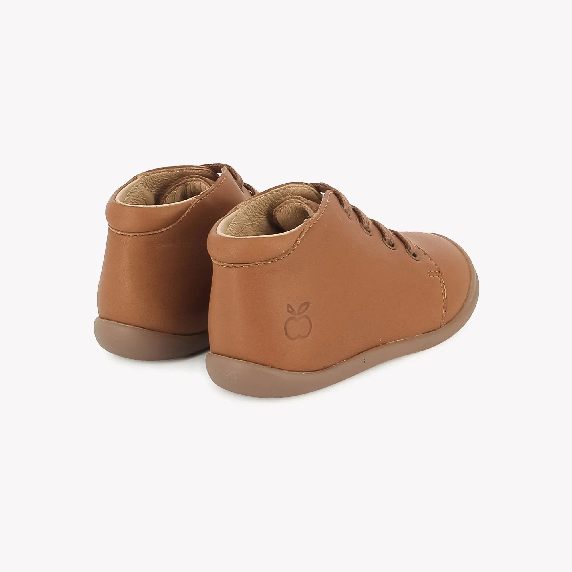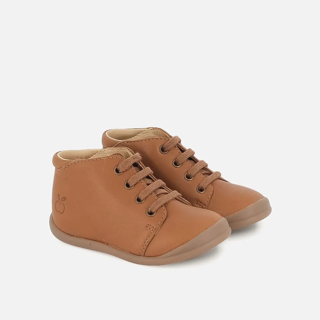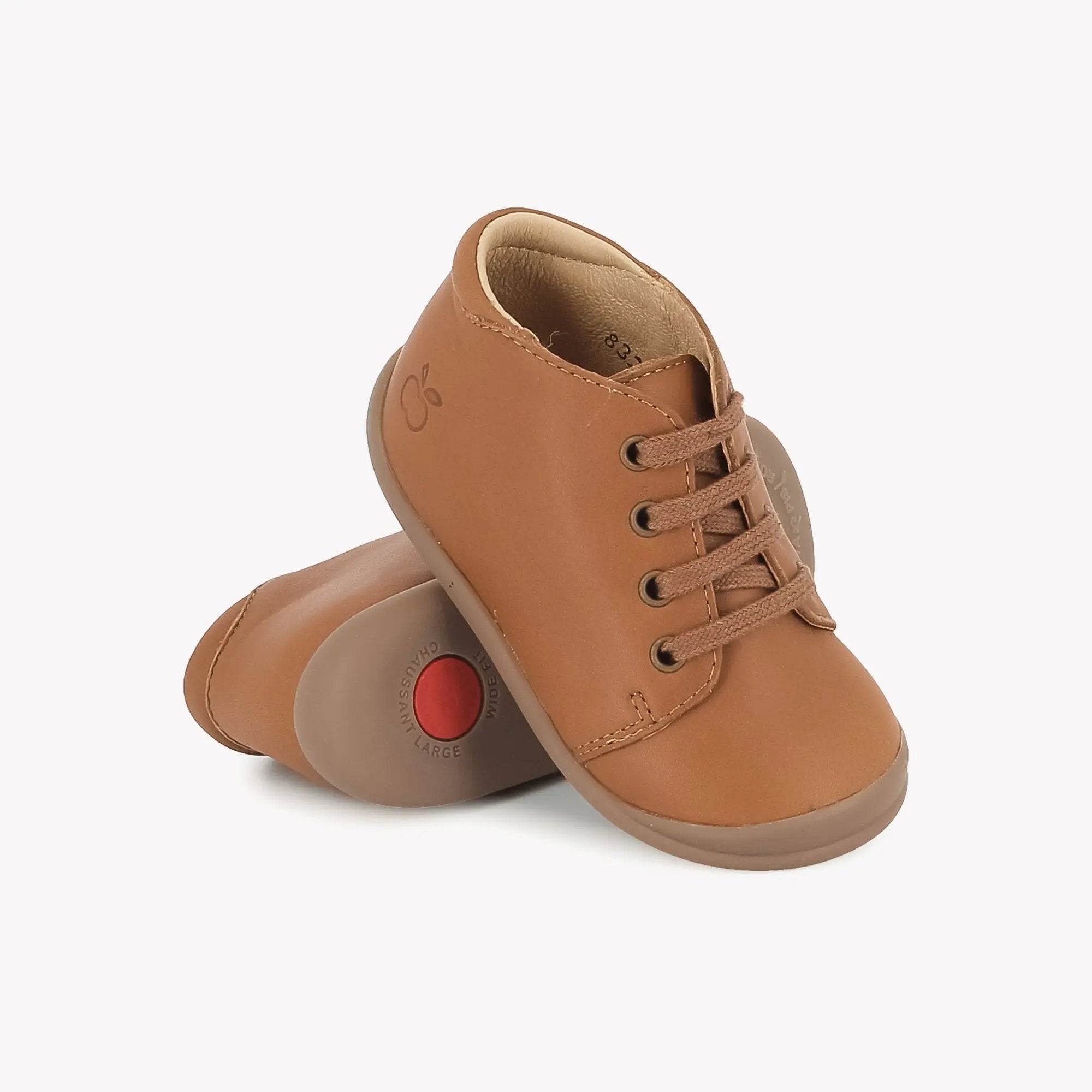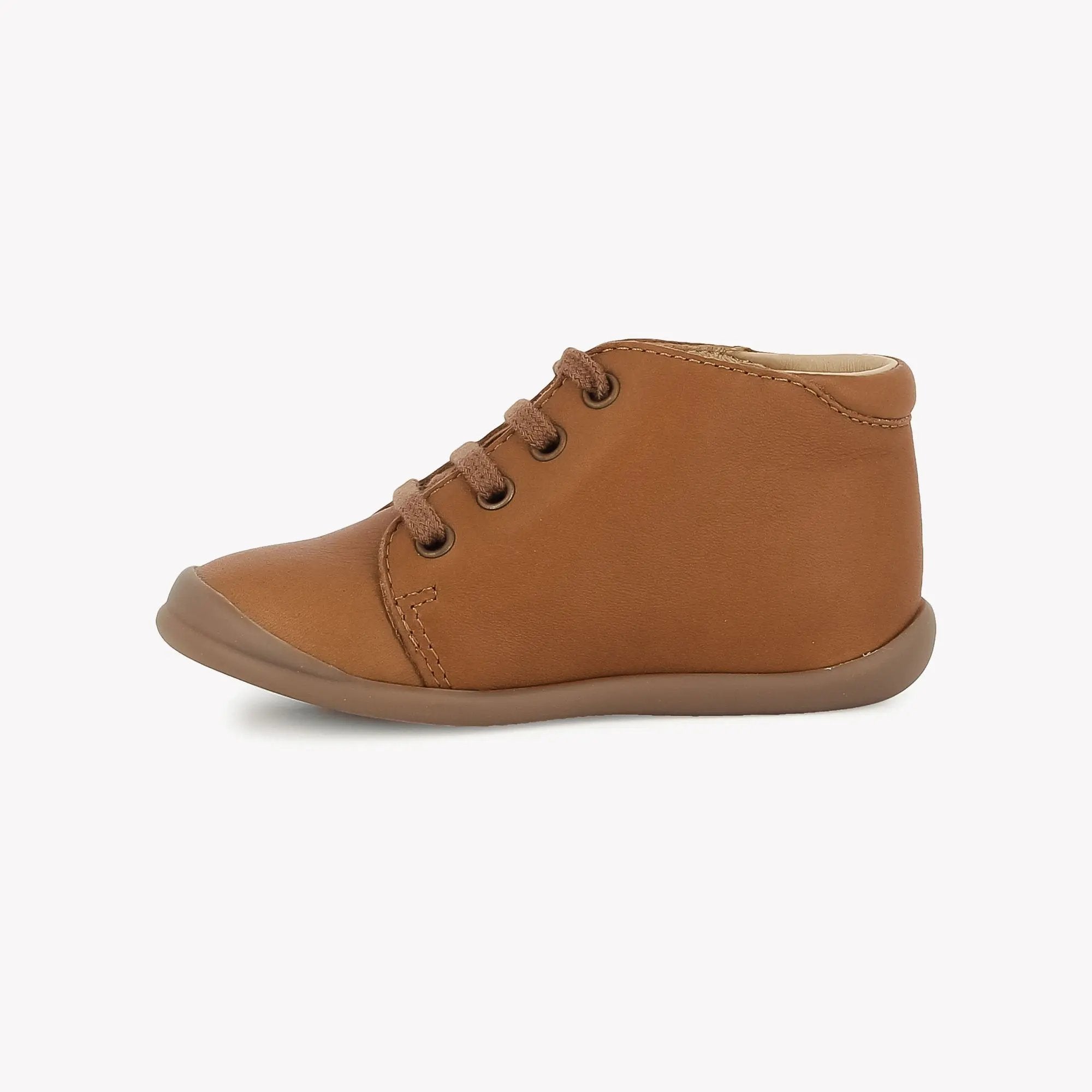 Dieser Schnürschuh für die ersten Schritte ist in einer Ausführung aus glattem, kamelfarbenem Leder erhältlich. Der leichte Schuh mit Gummisohle wurde aus hochwertigen Materialien gefertigt, um eine gesunde Fußentwicklung zu fördern. Eine Anti-Twist-Verstärkung an der Fersenseite sorgt für optimalen Halt und Stabilität, während der Vorderfußbereich flexibel bleibt. Zum Schutz wurde an der Schuhspitze eine Kappe angebracht. Schließlich Flex-Up Bottine für breite Füße geeignet.