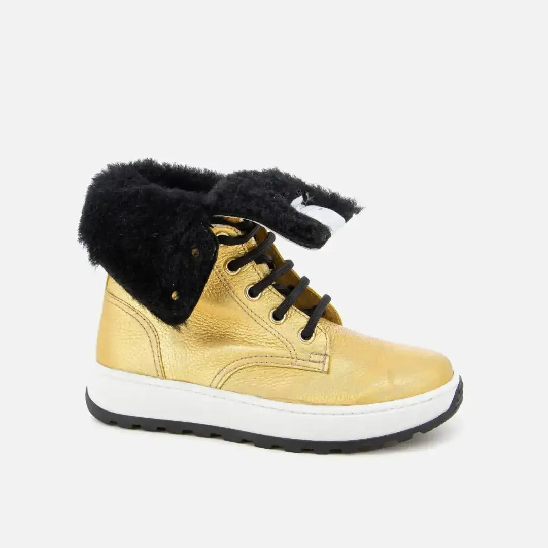 Diese hohe Schnürstiefelette für Kinder kommt in einer Version aus goldmetallicfarbenem Leder mit synthetischem Futter. Er ist leicht, flexibel und wurde mit hochwertigen Materialien für die richtige Entwicklung des Fußes entworfen. Der Schuh hat einen hohen Schaft für eine optimale Unterstützung des Knöchels und des Spanns und lässt sich dank der Schnürsenkel und des Reißverschlusses an der Innenseite leicht anziehen.