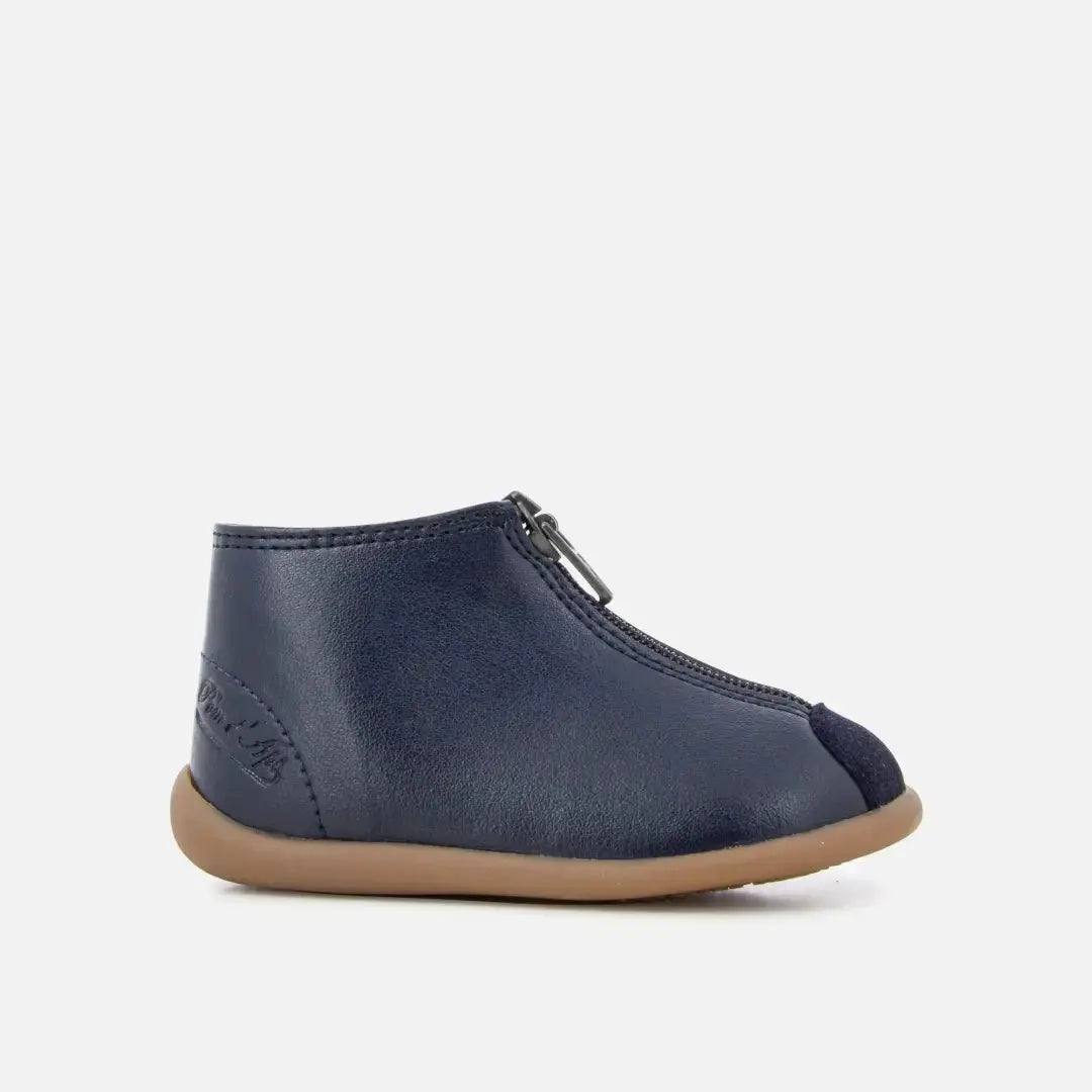 Dieser Babyschuh mit Reißverschluss wird hier in einer Version aus marinefarbenem Glattleder präsentiert. Er ist leicht und mit einer Gummisohle ausgestattet. Eine Anti-Twist-Verstärkung im hinteren Teil des Schuhs sorgt für optimalen Halt und Stabilität und bietet gleichzeitig Flexibilität im Vorderfußbereich.