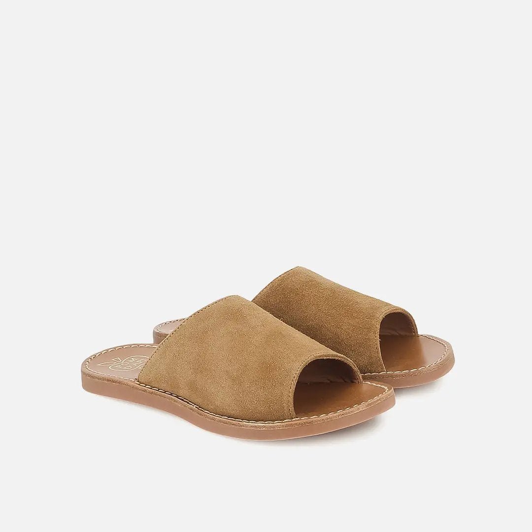 Diese Pantolette für Kinder wird in einer Version aus camelfarbenem Veloursleder präsentiert. Dieser weiche und leichte Schuh wurde aus hochwertigen Materialien für die richtige Entwicklung des Fußes hergestellt. Er hat eine gebogene Einlegesohle, die sich der Form des Fußes anpasst. Mit seinem Mule-Stil, der in verschiedenen Farben erhältlich ist, wird er Kinder und Mütter gleichermaßen begeistern!