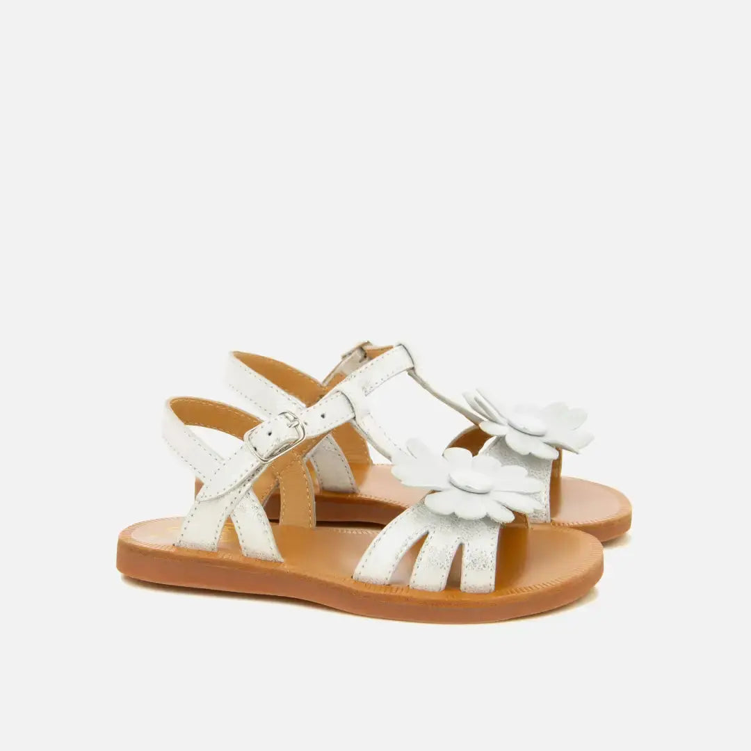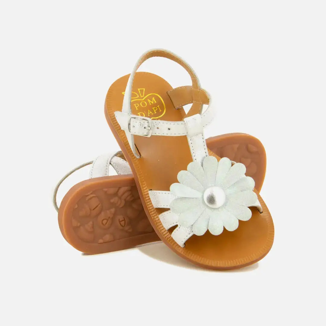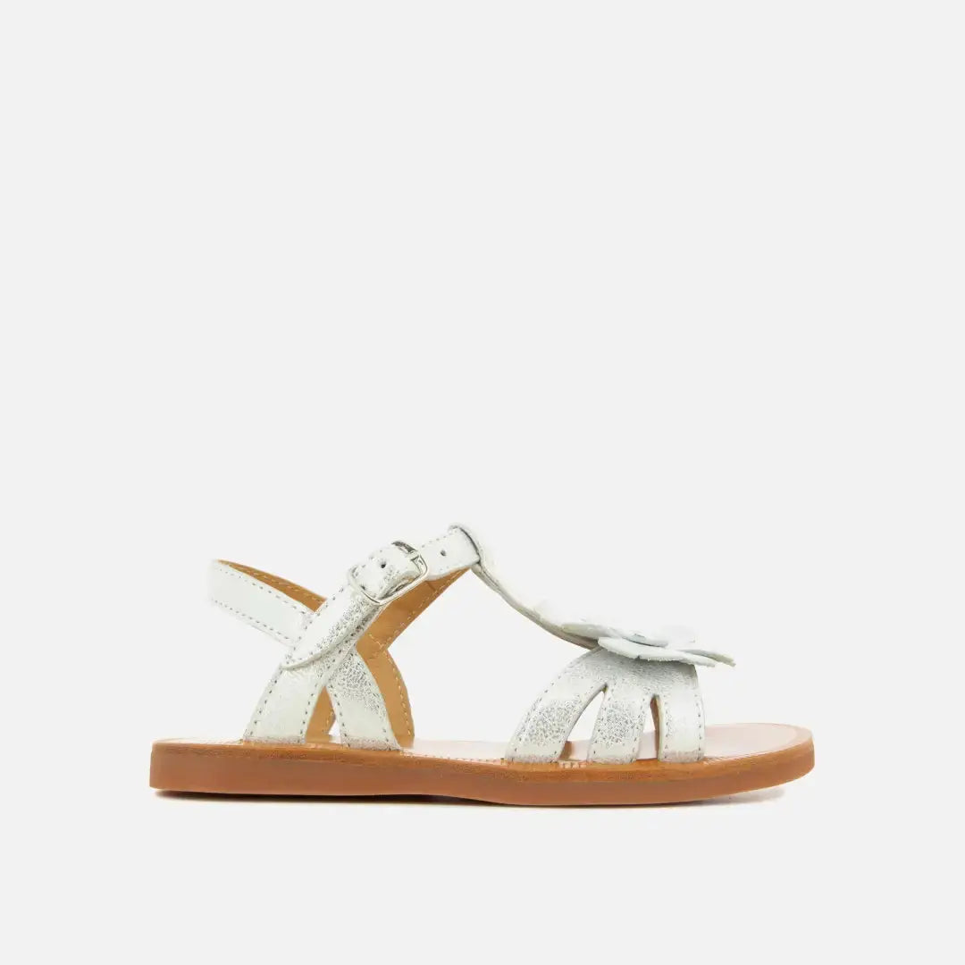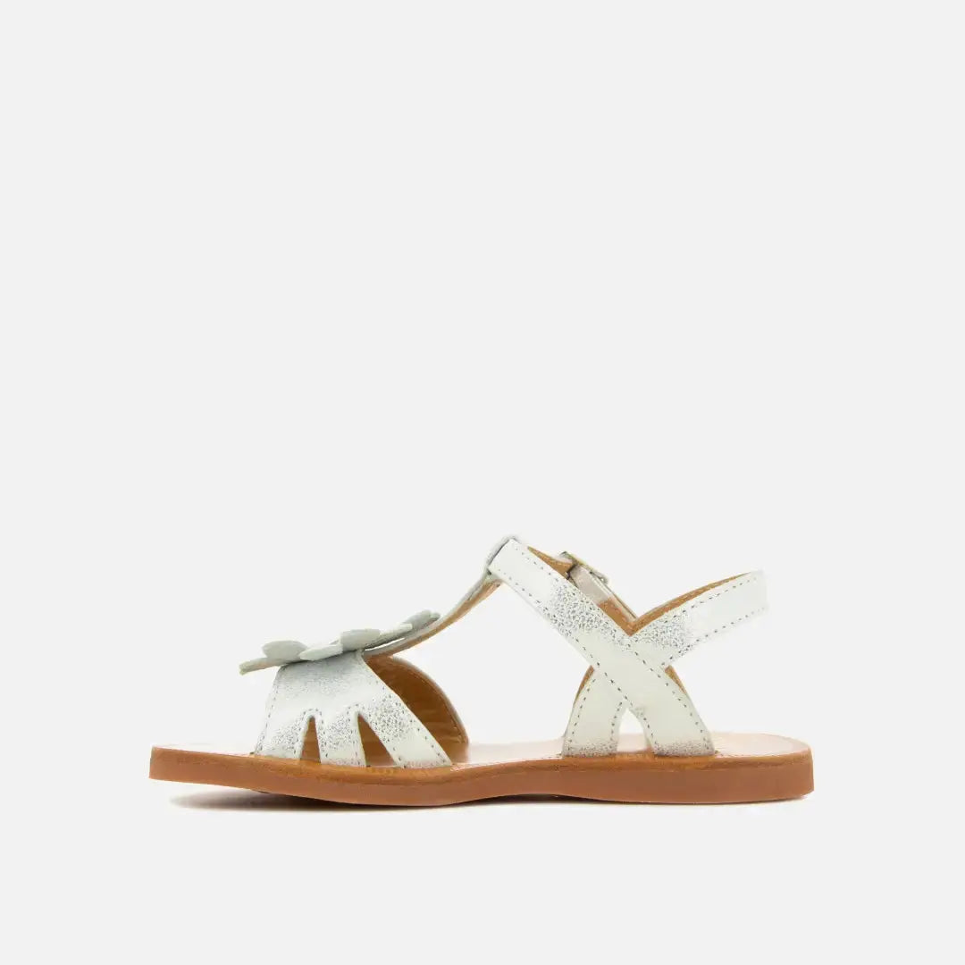 Diese Kindersandale ist in einer Ausführung aus silberfarbenem Kunstleder erhältlich und verfügt über einen Blumen-Einsatz an den Riemen. Dieser flexible und leichte Schuh wurde aus hochwertigen Materialien gefertigt, um die gesunde Entwicklung des Fußes zu fördern. Dank der verstellbaren Schnalle lässt er sich leicht am Knöchel anpassen.