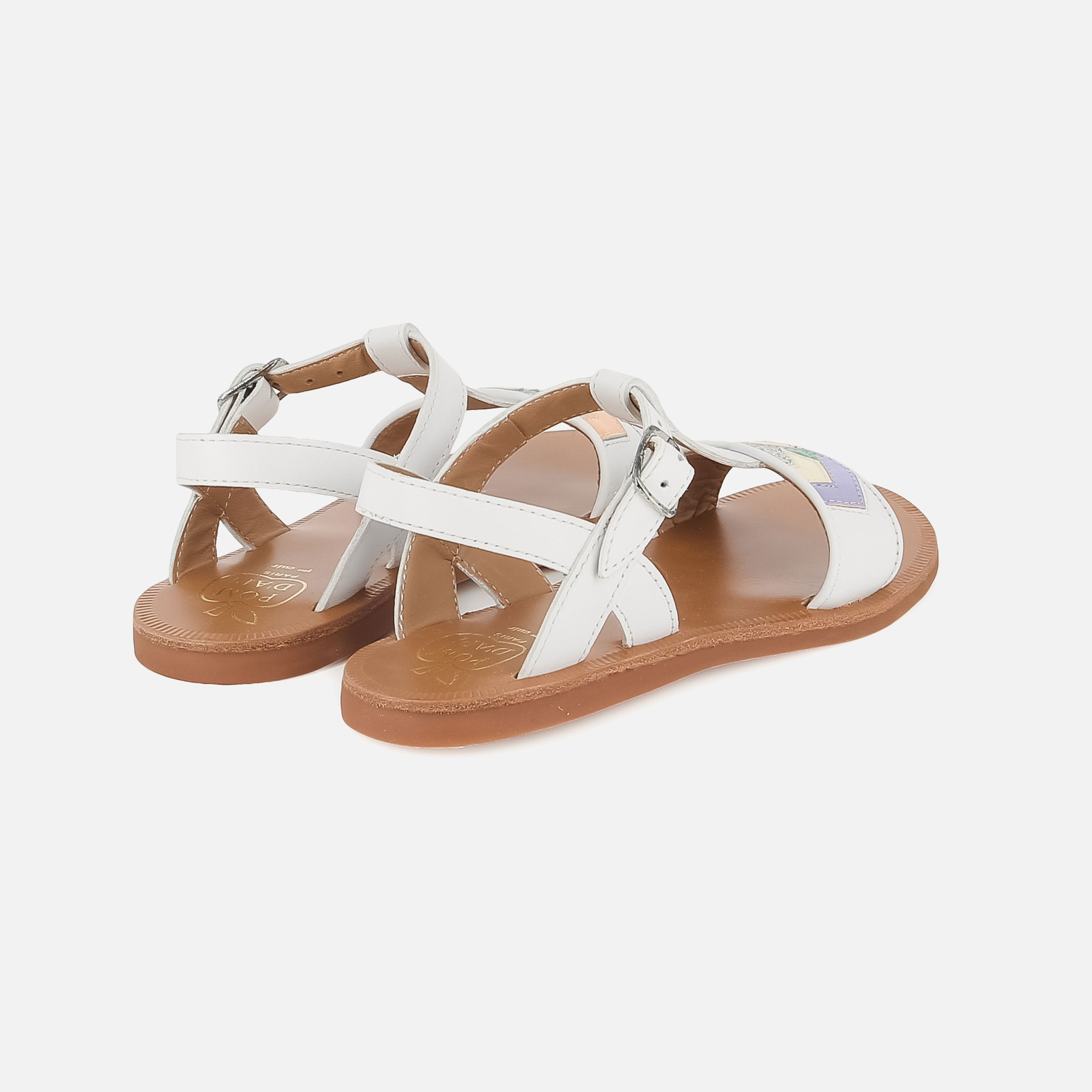 Diese Sandale für Kinder kommt in einer Version aus weißem Glattleder mit einem mehrfarbigen Riemen. Dieser weiche und leichte Schuh wurde mit hochwertigen Materialien für die richtige Entwicklung des Fußes hergestellt. Er lässt sich dank der verstellbaren Schnalle leicht an den Knöchel anpassen.