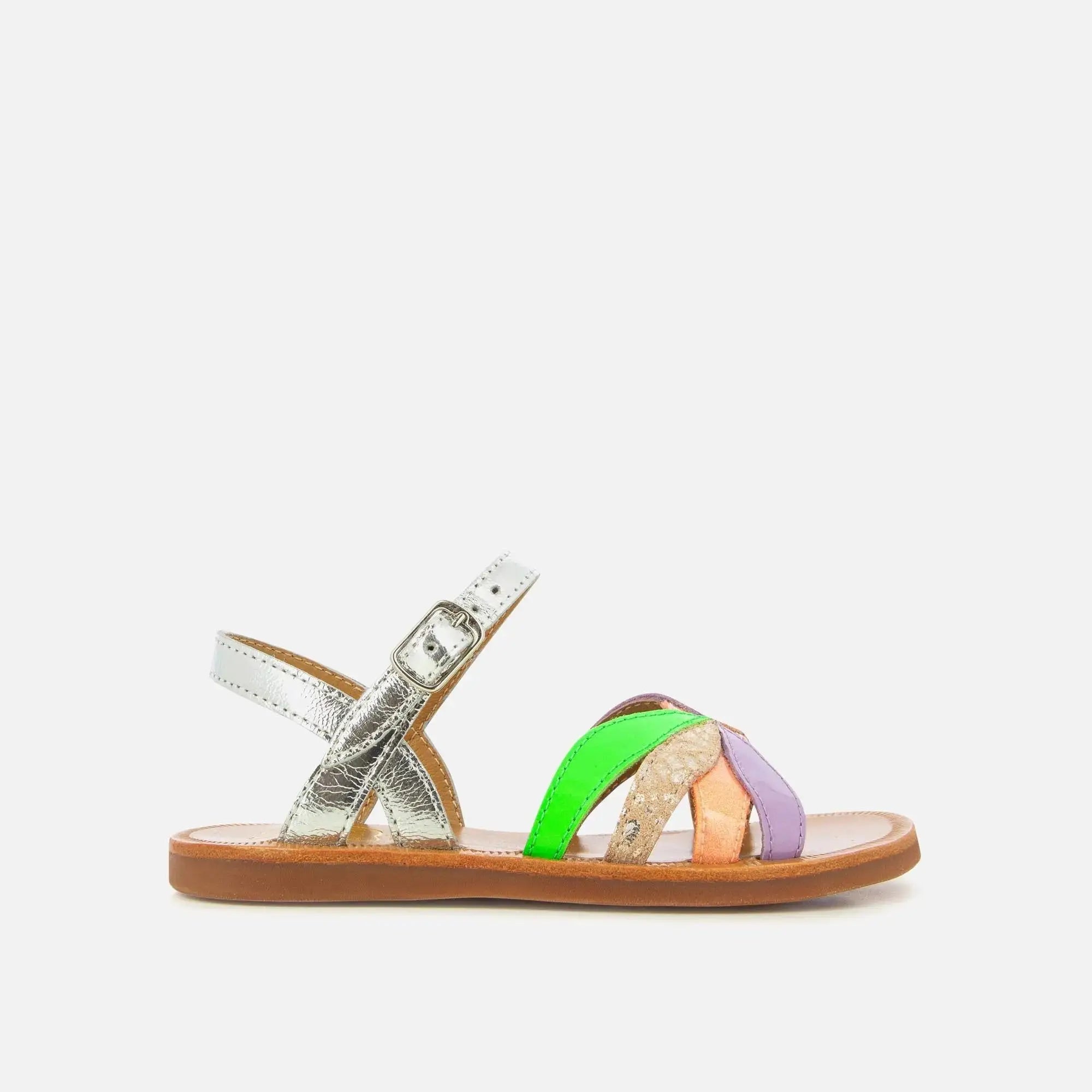 Diese Sandale für Kinder wird hier in mehrfarbigem Metallic-Leder präsentiert. Sie ist leicht und hat eine flexible Sohle, damit der Fuß gut abrollen kann. Durch die Schnalle leicht verstellbar, passt sie sich sowohl zierlichen als auch kräftigen Füßen perfekt an.