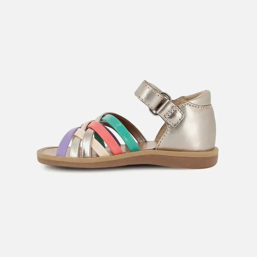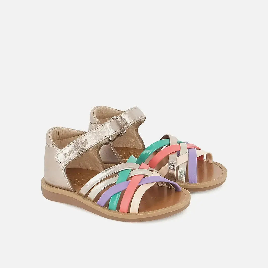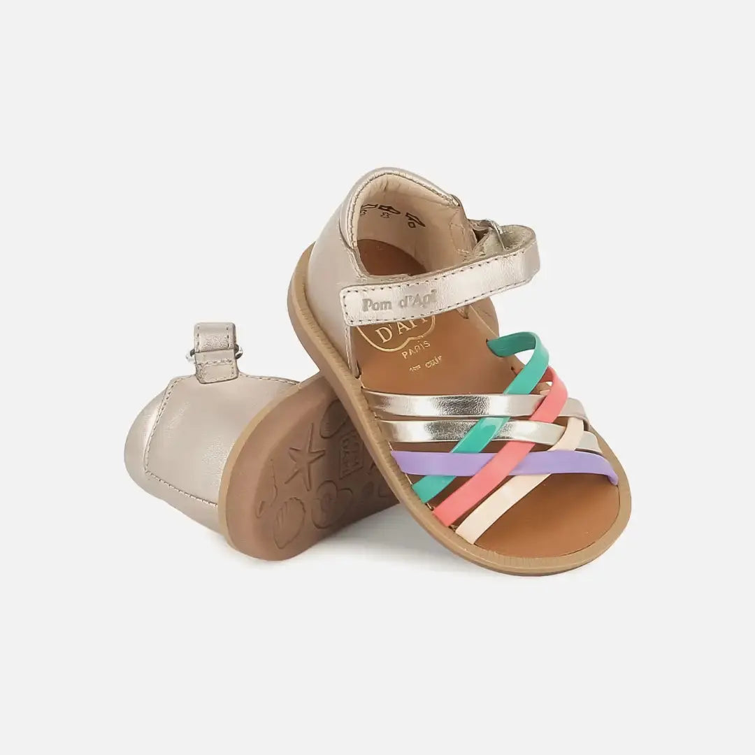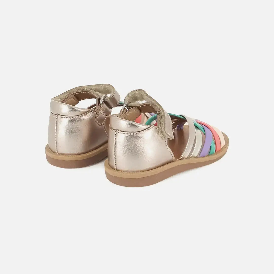 Diese Erstlingssandale kommt in einer Version aus platinfarbenem Metallic-Leder mit mehrfarbig verflochtenen Riemen. Dieser weiche und leichte Schuh wurde mit hochwertigen Materialien für die richtige Entwicklung des Fußes und das Laufenlernen entworfen. Er hat einen hohen Schaft, um Knöchel und Rist optimal zu stützen, und ist dank des Klettverschlusses leicht anzuziehen.