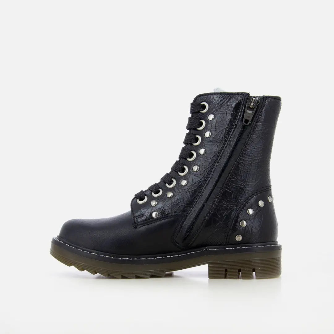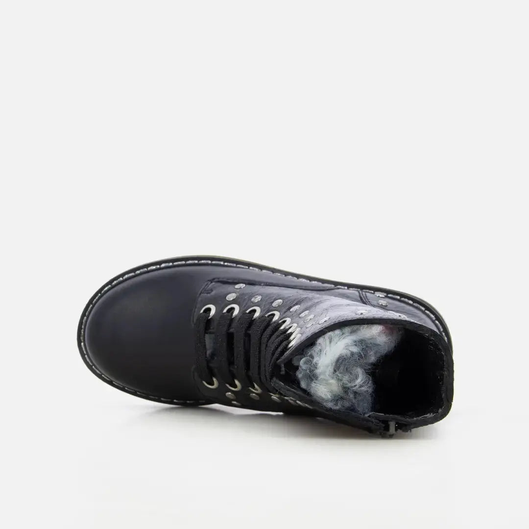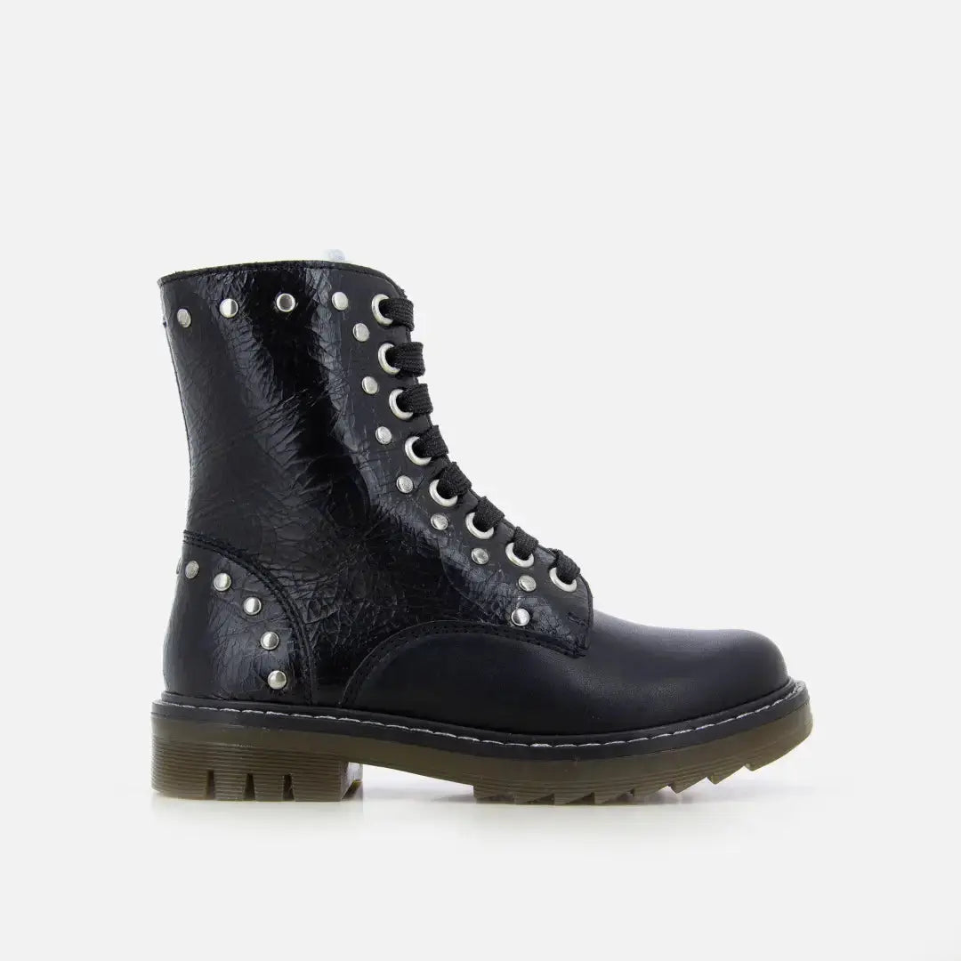 Diese knöchelhohe Stiefelette im Ranger-Stil für Kinder kommt in einer Version aus schwarzem Lackleder mit silbernen Nieten. Er ist leicht, flexibel und wurde mit hochwertigen Materialien für die richtige Entwicklung des Fußes hergestellt. Der Schuh hat einen hohen Schaft, der Knöchel und Rist optimal stützt, und lässt sich dank der Schnürsenkel und des Reißverschlusses an der Innenseite leicht anziehen. Er ist außerdem mit einer flexiblen gezackten Gummisohle ausgestattet, um rutschfest zu sein.
