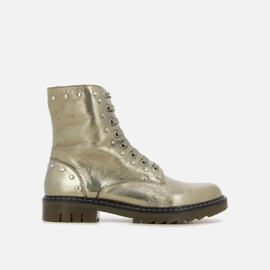 Diese knöchelhohe Stiefelette im Ranger-Stil für Kinder kommt in einer Version aus bronzefarbenem Metallic-Leder mit silbernen Nieten und einer synthetischen Niete. Er ist leicht, flexibel und wurde mit hochwertigen Materialien für die richtige Entwicklung des Fußes entworfen. Der Schuh hat einen hohen Schaft mit einem synthetischen Revers aus Fellimitat, um Knöchel und Rist optimal zu stützen, und lässt sich dank der Schnürsenkel und des Reißverschlusses an der Innenseite leicht anziehen. Er ist außerdem mit einer flexiblen gezackten Gummisohle ausgestattet, um rutschfest zu sein.