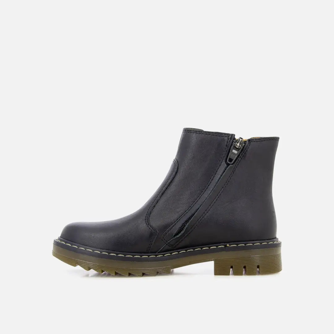Diese Stiefelette für Kinder kommt in einer Version aus schwarzem Glattleder mit einem Gummizug. Sie ist leicht, geschmeidig und wurde mit hochwertigen Materialien für die richtige Entwicklung des Fußes hergestellt. Der Schuh hat einen hohen Schaft, um Knöchel und Rist optimal zu stützen, und ist dank des innenliegenden Reißverschlusses und des Gummizugs leicht anzuziehen. Er ist außerdem mit einer flexiblen gezackten Gummisohle ausgestattet, um rutschfest zu sein.