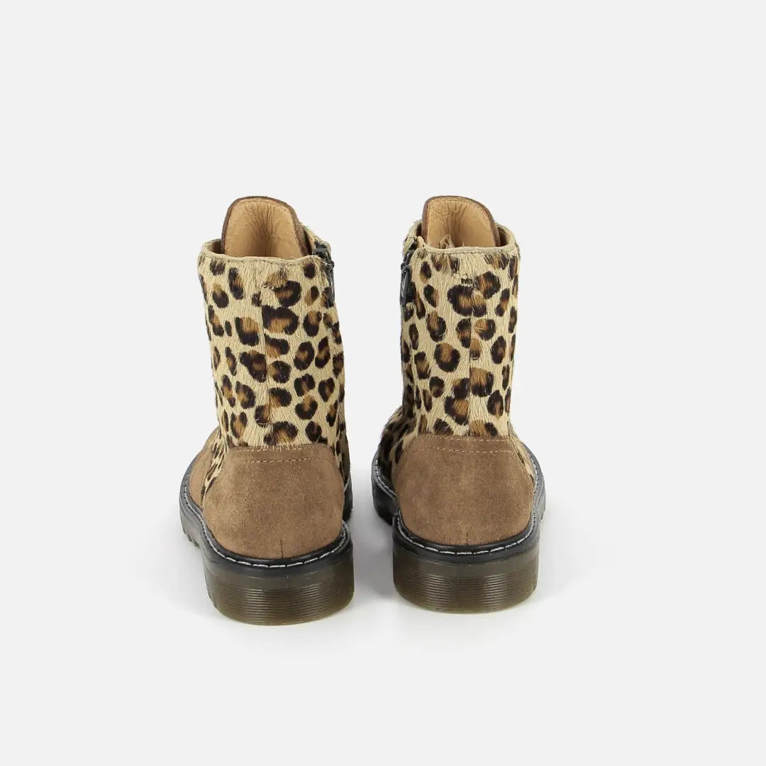 Diese knöchelhohe Stiefelette im Ranger-Stil für Kinder kommt in einer Version aus Samt mit Leopardenmuster daher. Sie ist leicht, flexibel und wurde mit hochwertigen Materialien für die richtige Entwicklung des Fußes hergestellt. Der Schuh hat einen hohen Schaft für eine optimale Unterstützung des Knöchels und des Spanns und lässt sich dank der Schnürsenkel und des Reißverschlusses an der Innenseite leicht anziehen. Er ist außerdem mit einer flexiblen gezackten Gummisohle ausgestattet, um rutschfest zu sein.