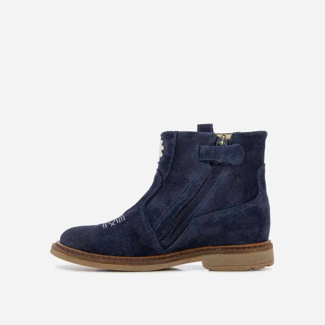 Diese Stiefelette aus blauem Veloursleder zeichnet sich durch ihre geblümten Einsätze aus, die emblematische Signatur von Pom d'Api. Sie ist leicht und flexibel und bietet dem Fuß einen ausgezeichneten Halt. Der hohe Schaft aus Leder sorgt für eine optimale Unterstützung des Knöchels und des Rists, während der Reißverschluss an der Innenseite das Anziehen erleichtert.