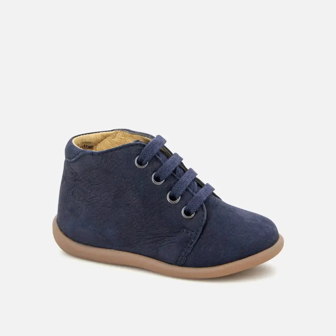 Dieser Erstlingsschuh mit Schnürsenkeln für Kinder kommt in einer Version aus marinefarbenem Veloursleder. Der Schuh ist leicht, hat eine Gummisohle und wurde mit hochwertigen Materialien für die gesunde Entwicklung des Fußes hergestellt. Eine Anti-Twist-Verstärkung im hinteren Teil des Schuhs sorgt für optimalen Halt und Stabilität und bietet gleichzeitig Flexibilität im Vorfußbereich.