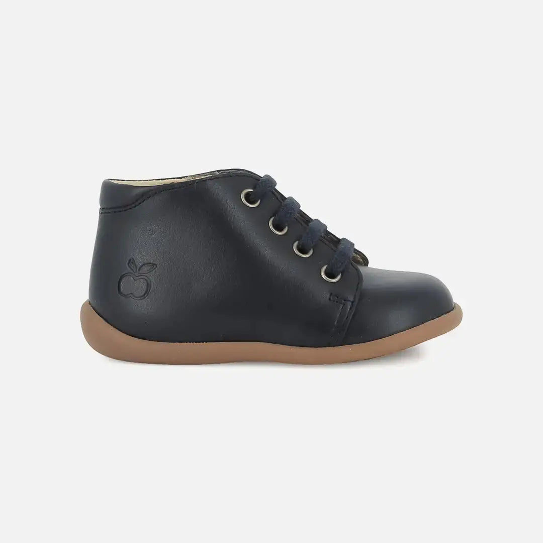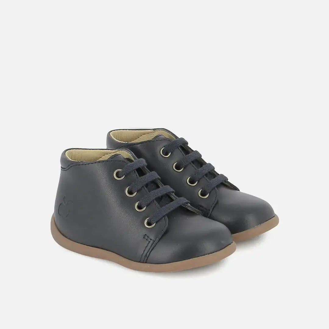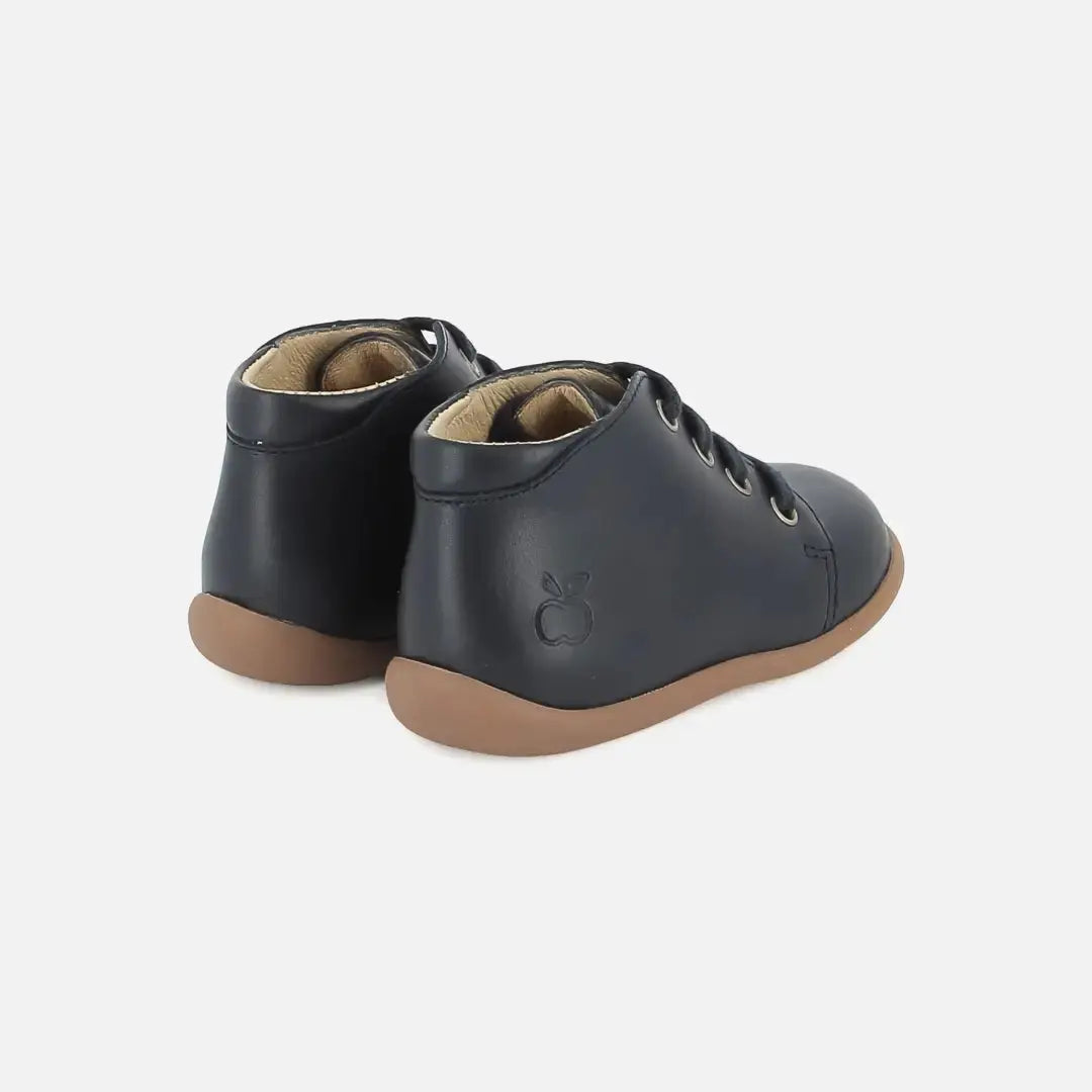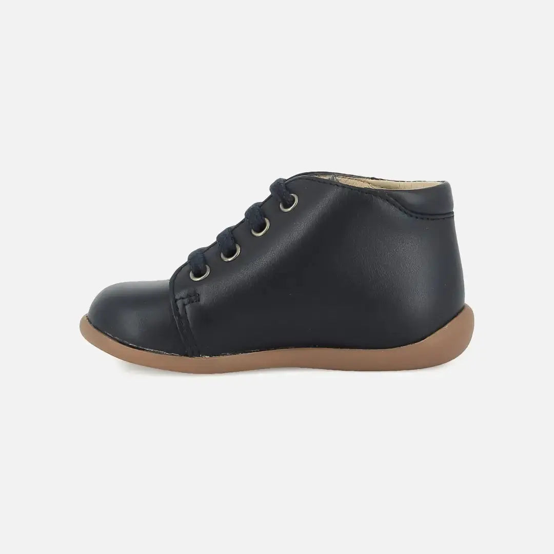 Dieser Erstlingsschuh mit Schnürsenkeln für Kinder kommt in einer Version aus marineblauem Glattleder. Der Schuh ist leicht, hat eine Gummisohle und wurde mit hochwertigen Materialien für die gesunde Entwicklung des Fußes hergestellt. Eine Anti-Twist-Verstärkung im hinteren Teil des Schuhs sorgt für optimalen Halt und Stabilität und bietet gleichzeitig Flexibilität im Vorfußbereich.