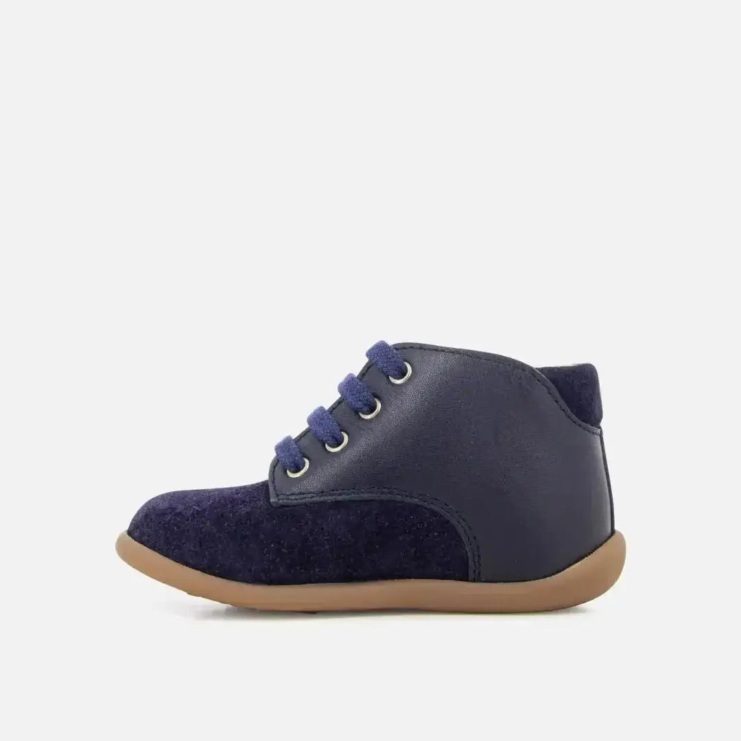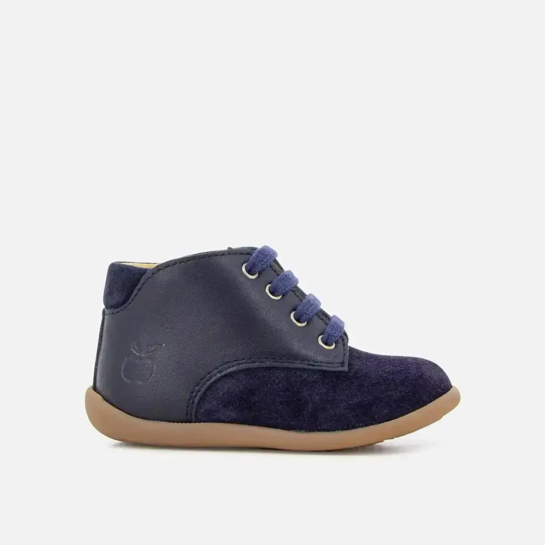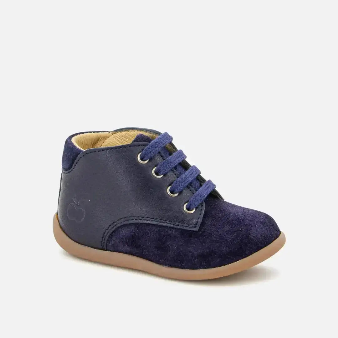 Dieser Erstlingsschuh mit Schnürsenkeln für Kinder kommt in einer Version aus zwei Materialien, Glattleder und marinefarbenem Veloursleder. Der Schuh ist leicht, hat eine Gummisohle und wurde mit hochwertigen Materialien für eine gesunde Entwicklung des Fußes hergestellt. Eine Anti-Twist-Verstärkung im hinteren Teil des Schuhs sorgt für optimalen Halt und Stabilität und bietet gleichzeitig Flexibilität im Vorfußbereich.