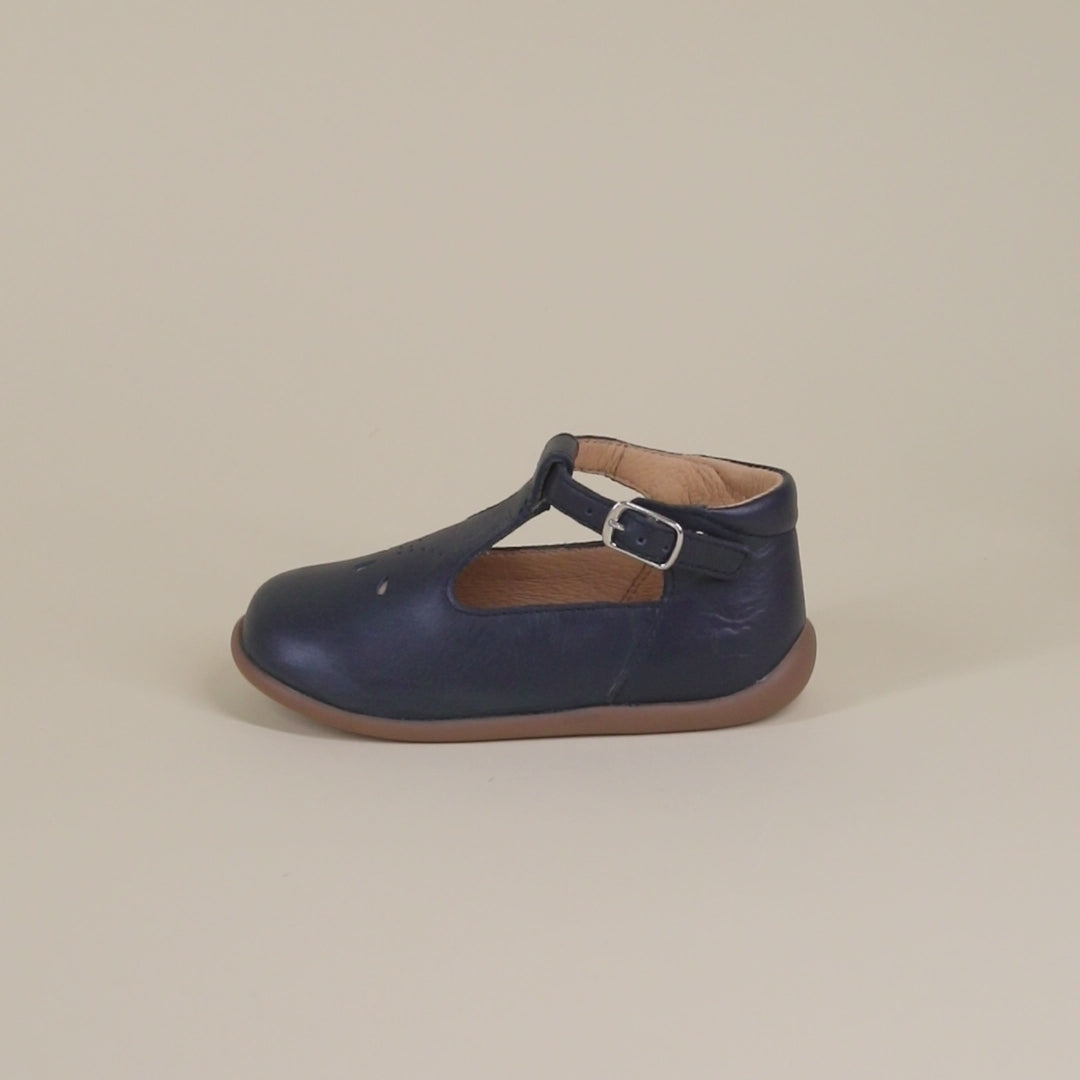 Diese Erstlings-Salome kommt in einer Version aus marineblauem Glattleder mit Perforationen an der Vorderseite. Dieser leichte Schuh mit Gummisohle wurde mit hochwertigen Materialien für die richtige Entwicklung des Fußes hergestellt. Eine Anti-Twist-Verstärkung im hinteren Teil des Schuhs sorgt für optimalen Halt und Stabilität und bietet gleichzeitig Flexibilität im Vorfußbereich. Der Schuh lässt sich dank der verstellbaren Schnalle am Knöchel leicht an den Knöchel anpassen.