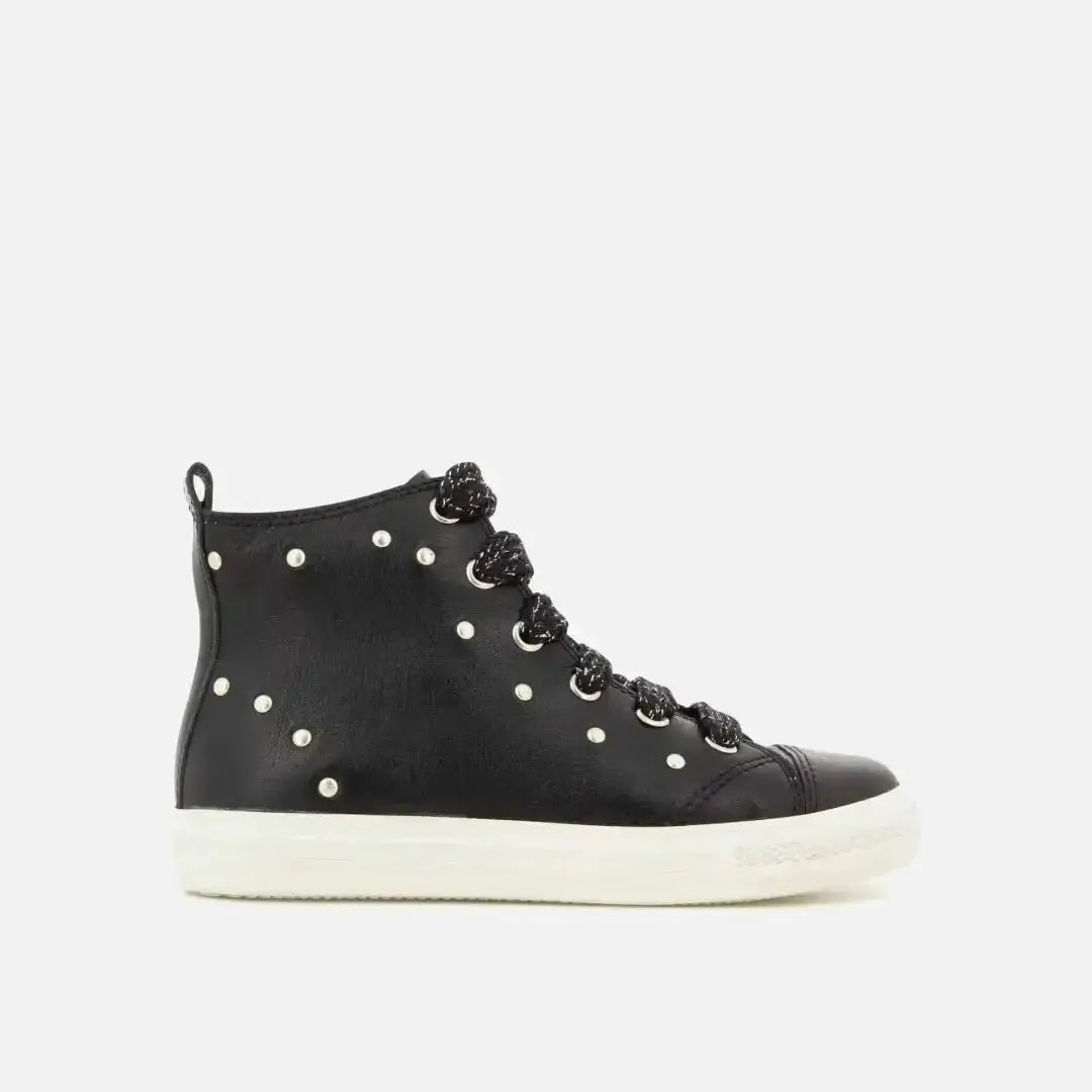 Dieser Sneaker für Kinder, wird hier in einer Version aus schwarzem Glattleder mit silbernen Nieten präsentiert. Er ist leicht und mit einer Gummisohle ausgestattet. Er lässt sich dank des Reißverschlusses an der Innenseite leicht anziehen und mit der Schnürung an Knöchel und Rist anpassen.