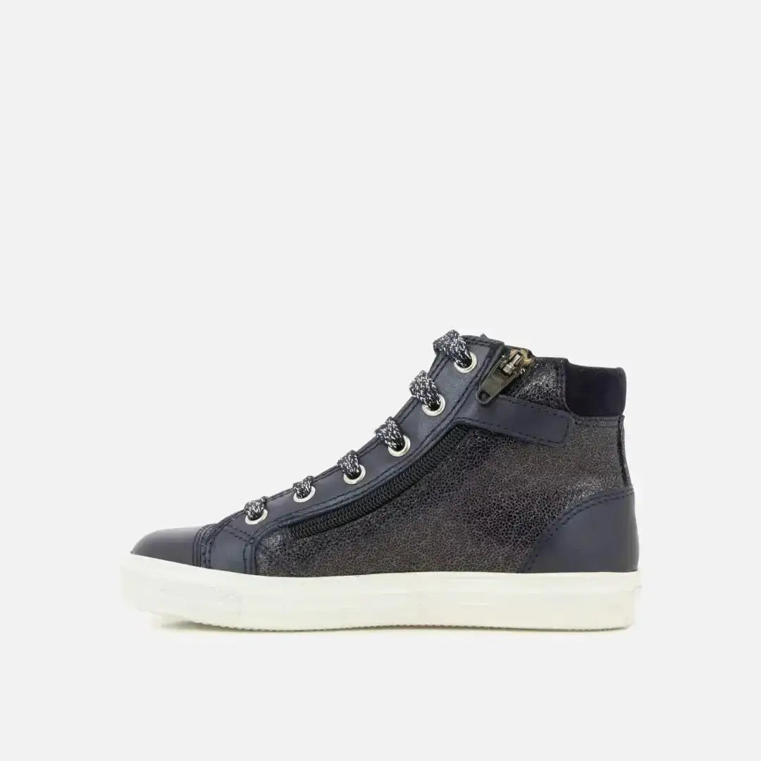 Dieser Sneaker für Kinder, wird hier in einer Version aus zwei Materialien präsentiert: Metallic-Leder und marinefarbenes Glattleder. Er ist leicht und hat eine Gummisohle. Er lässt sich dank des Reißverschlusses an der Innenseite leicht anziehen und mit der Schnürung an Knöchel und Rist anpassen.