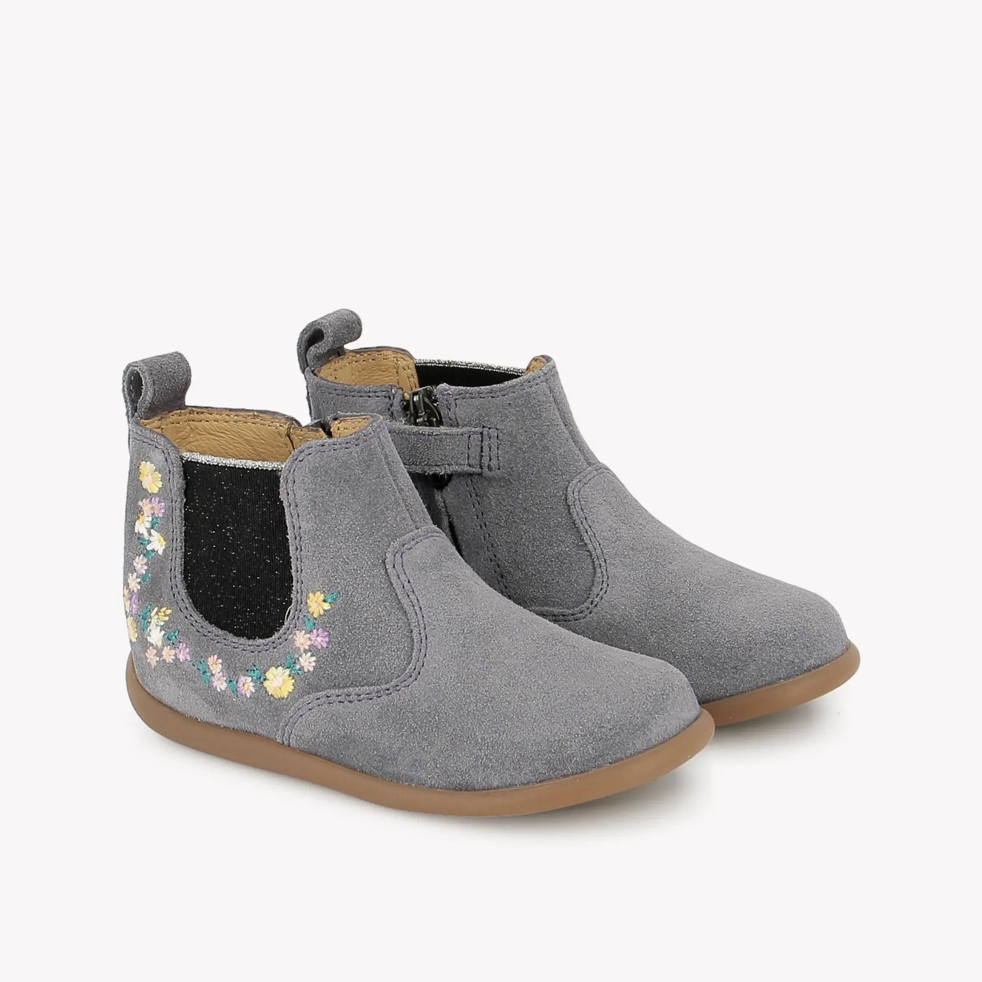 Diese First-Passion-Stiefelette präsentiert sich in violettem Veloursleder mit gestickten Details. Sie hat einen innenliegenden Reißverschluss mit Gummizug für einen leichten Einstieg in die Schuhe. Sie ist mit einem patentierten Anti-Twist©-Cambridgesystem ausgestattet, das im Fersenbereich in die Sohle integriert ist.