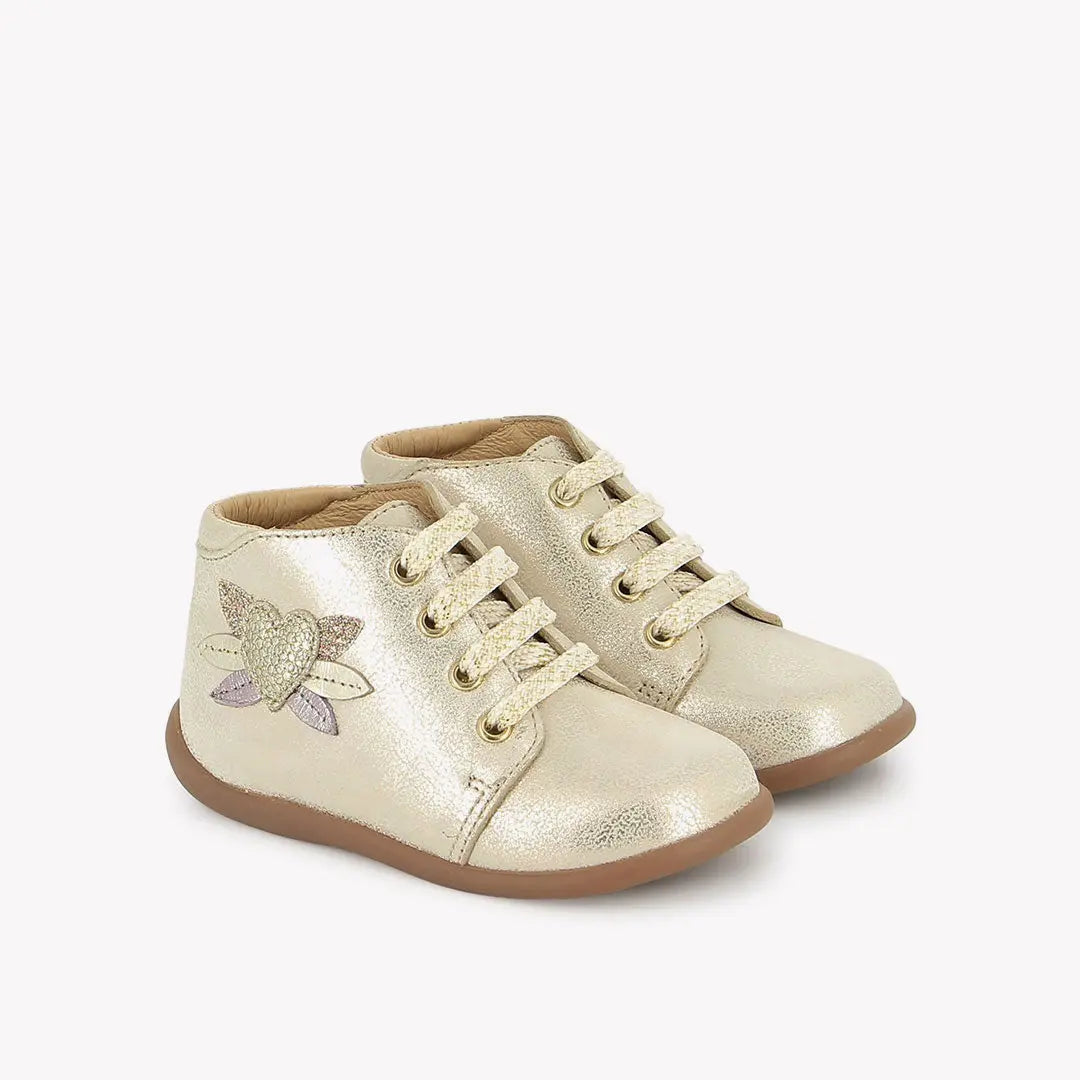Dieser Derby-Schuh wurde für aktive Kinder entworfen und kombiniert glattes Leder mit einem Schnürverschluss. Die flexible Sohle sorgt für Bewegungsfreiheit und die Lederbrandsohle für Komfort. Die Gummisohle enthält ein Cambridgesystem, das an der Ferse angebracht ist. Diese Verstärkung verhindert dank des von Pom d'Api patentierten Anti-Twist©-Systems ein Umknicken des Knöchels und des Rists. Die goldene Farbe rundet das funktionelle und moderne Design ab.