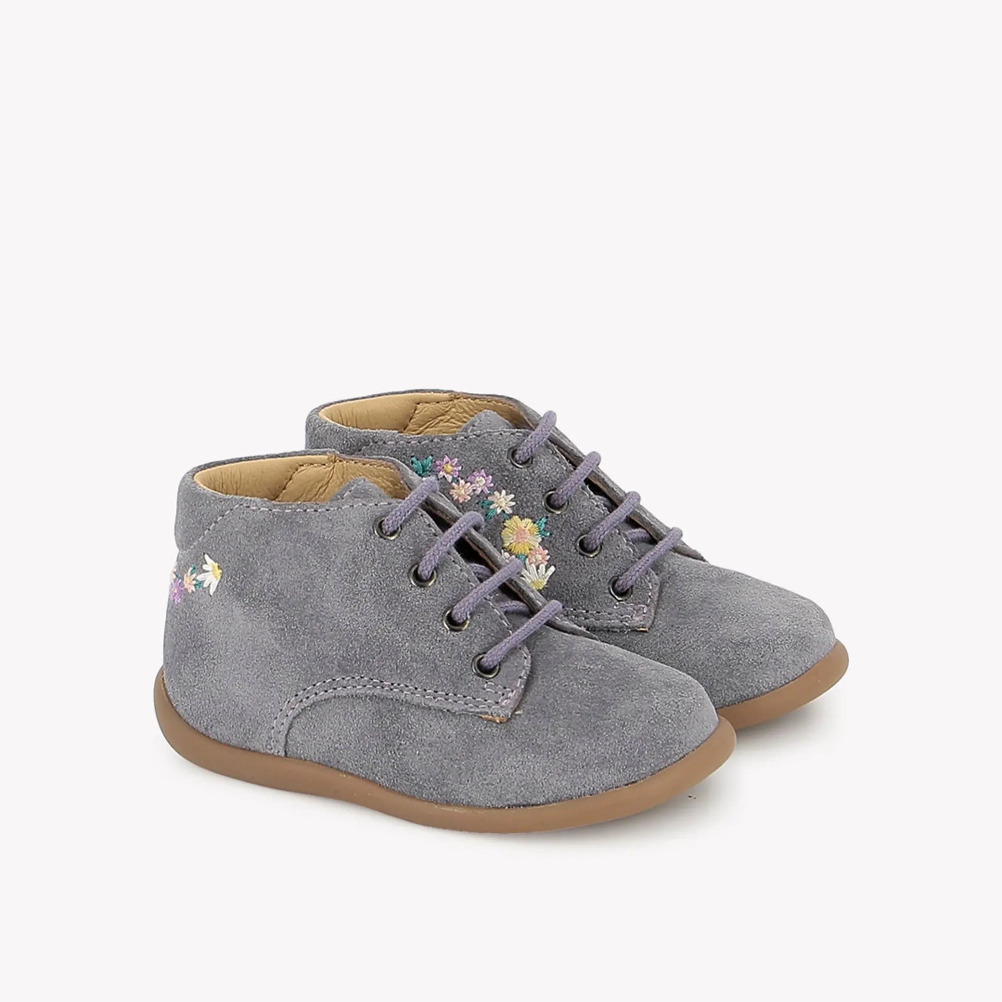 Gefertigt aus violettem Veloursleder mit gestickten Details, vereint dieses Modell Eleganz und Technik, um die ersten Schritte zu begleiten.