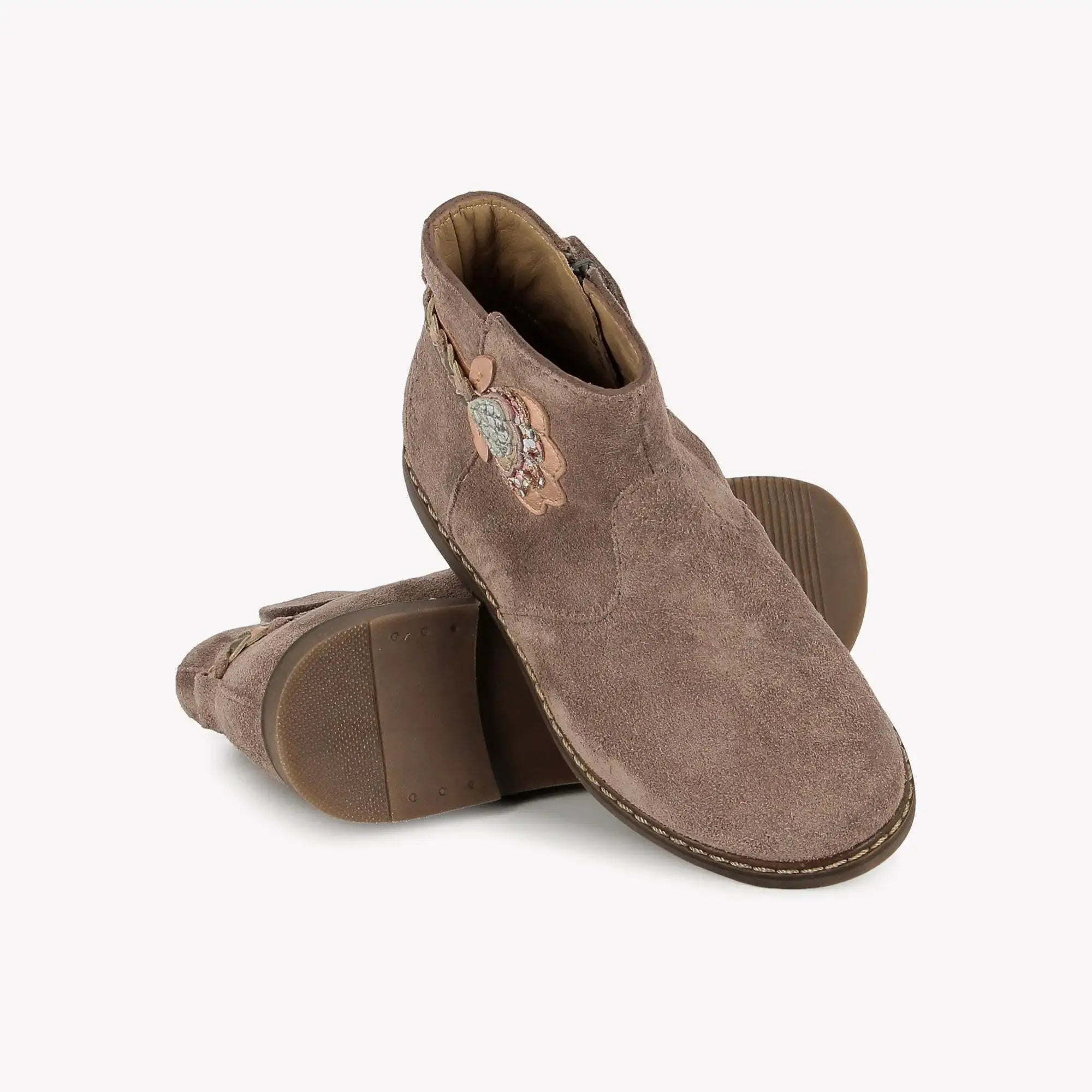 Diese Stiefelette aus altrosafarbenem Veloursleder zeichnet sich durch die floralen Einsätze aus, die das Markenzeichen von Pom d'Api sind. Dank des Reißverschlusses an der Innenseite lässt sich der Schuh leicht anziehen und bietet einen guten Halt für den Fuß, während er gleichzeitig viel Bewegungsfreiheit lässt.