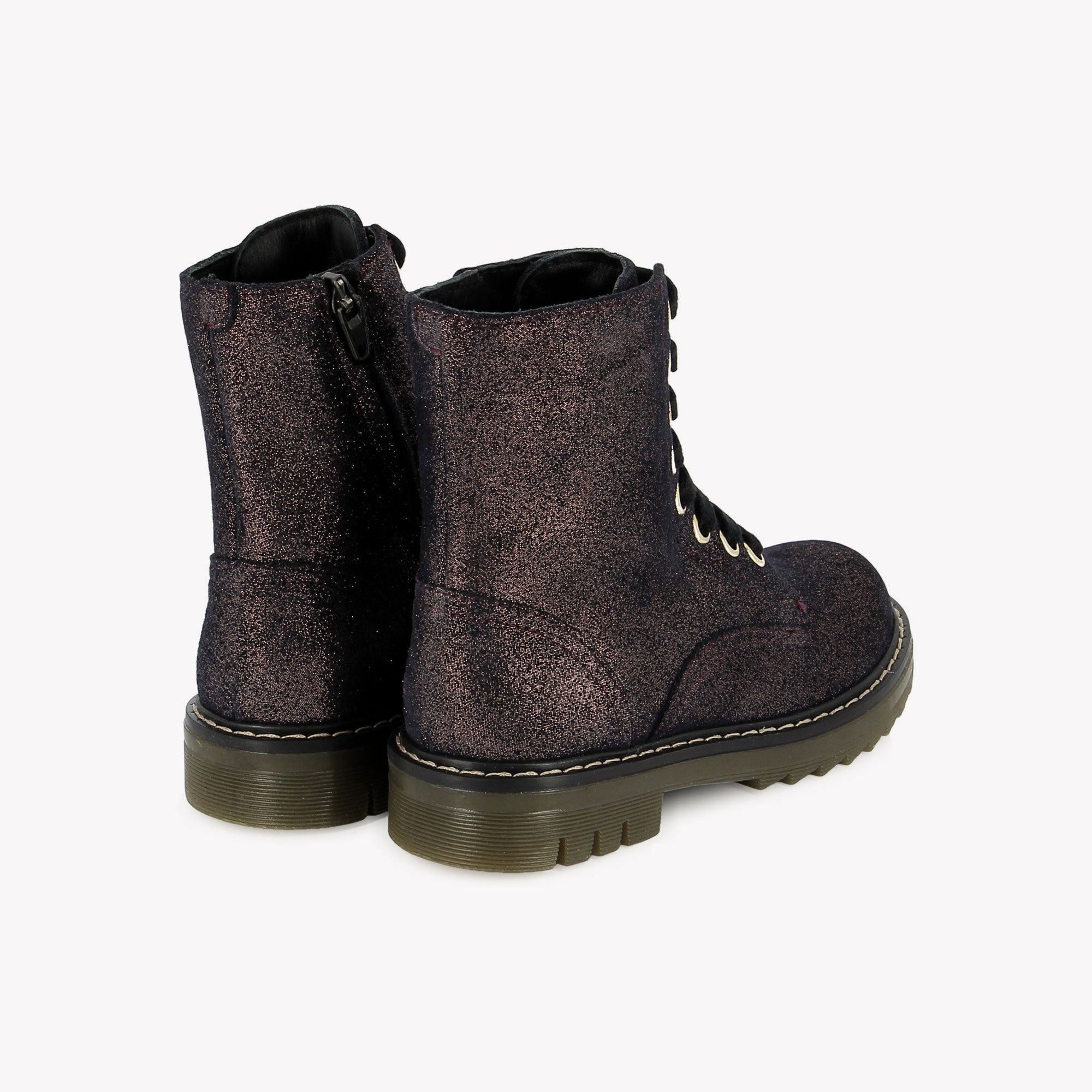 Diese hohe Stiefelette aus Veloursleder mit Pailletten ist vom Ranger-Stil inspiriert und verfügt über einen Schnürverschluss, der mit einem Innenreißverschluss kombiniert ist, um das Anziehen zu erleichtern. Die rutschfeste, gezackte Sohle bietet einen hervorragenden Grip. Die Einlegesohle aus Leder sorgt für eine angenehme Passform.