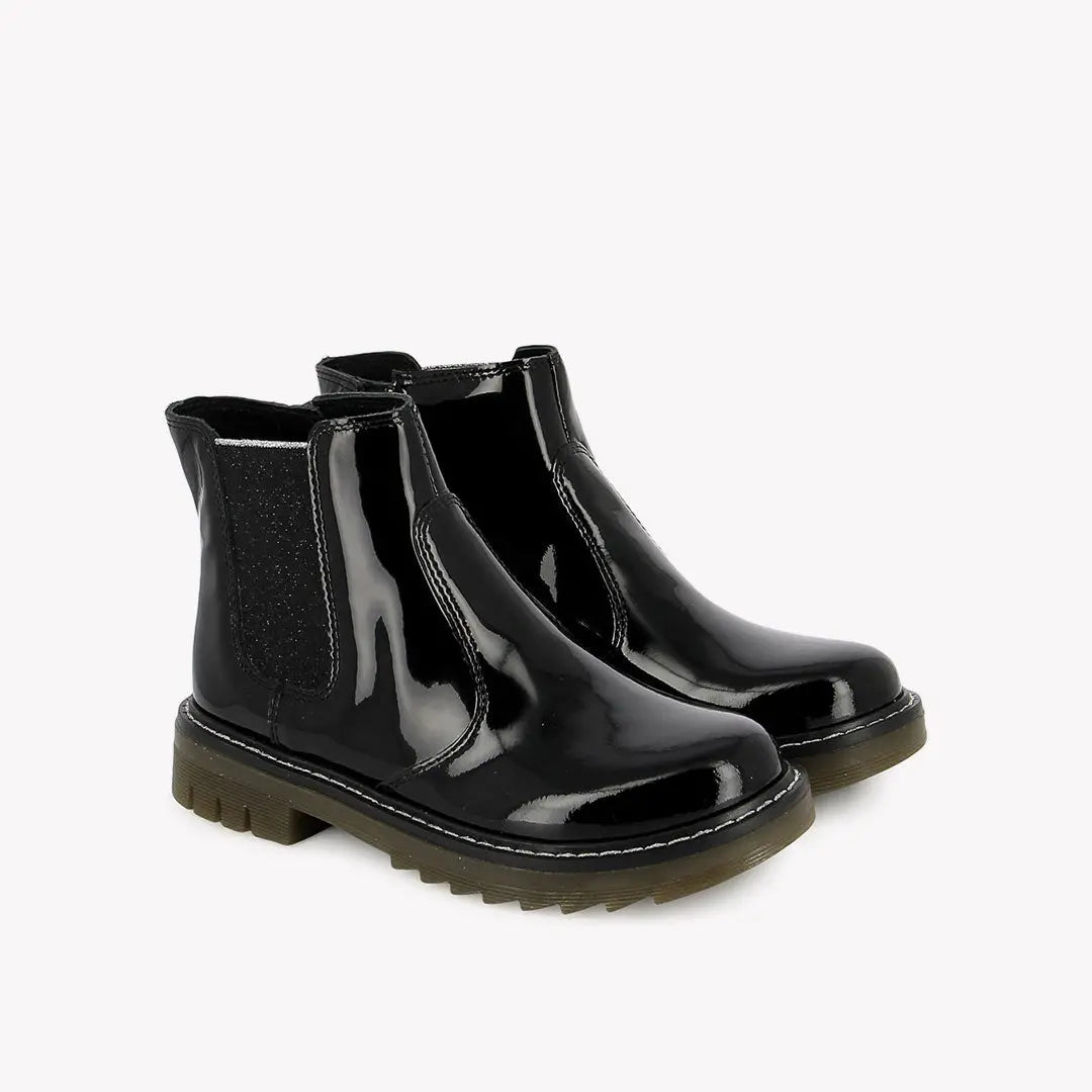 Diese Stiefelette aus schwarzem Lackleder lässt sich dank eines Gummizugs und eines Reißverschlusses an der Innenseite leicht anziehen.