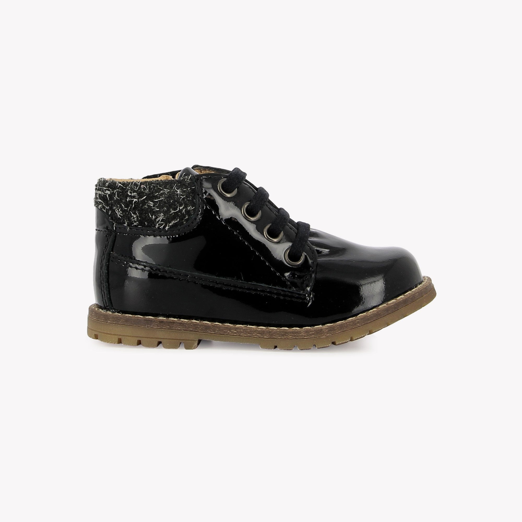 Das ist neu! Dieser Schuh aus Glattleder ist für kleine Größen geeignet und lässt sich mithilfe eines Schnürverschlusses und eines Reißverschlusses an der Innenseite leicht anpassen. Der Schuh ist vom Workwear-Trend inspiriert und zeichnet sich durch seinen abgesetzten Absatz und die Metallösen aus. Der Schuh hat eine Innensohle aus Leder für mehr Weichheit und Hygiene. Die schwarze Farbe macht diesen Schuh zu einem unverzichtbaren Begleiter für den Alltag.