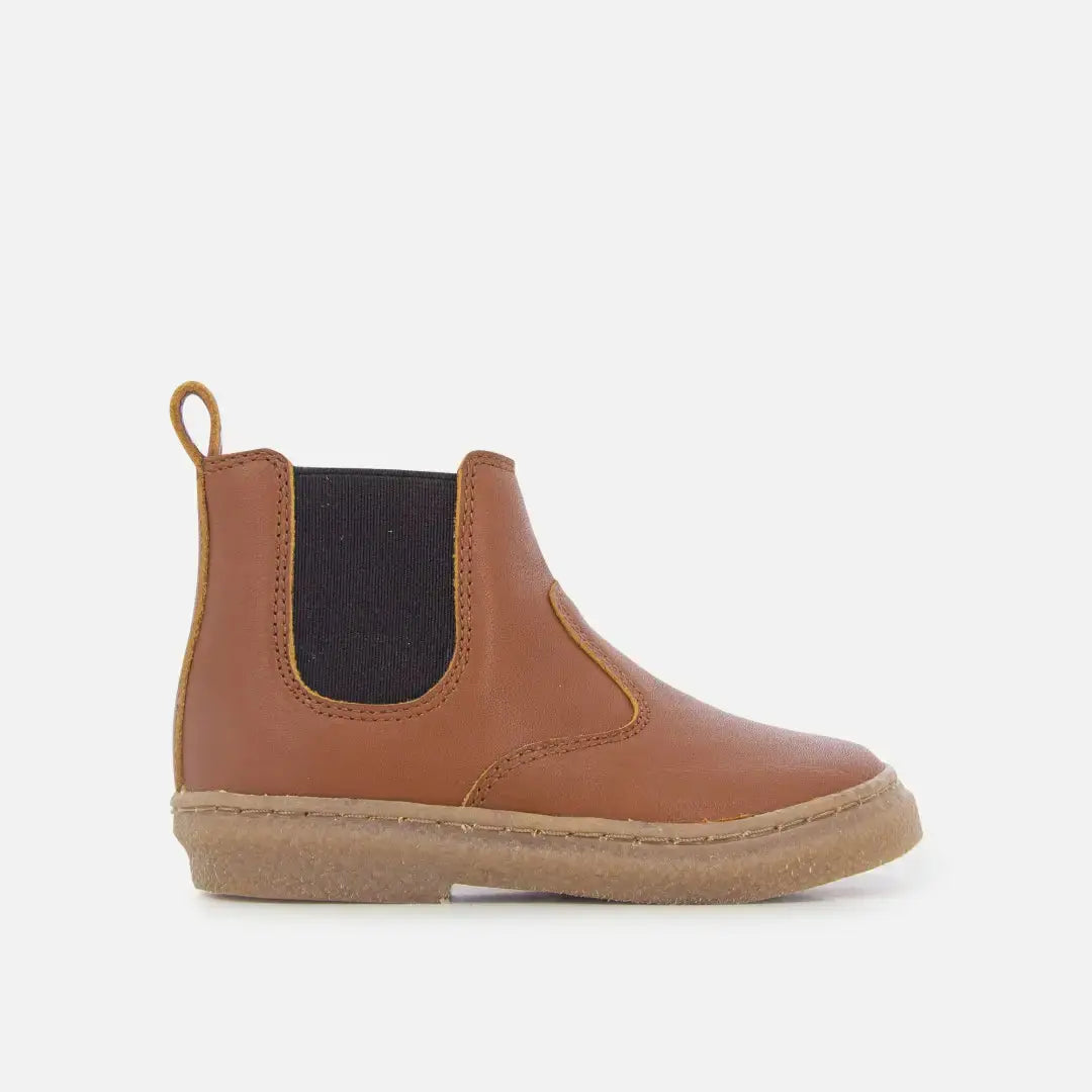 Diese Stiefelette für Kinder kommt in einer Version aus camelfarbenem Glattleder mit einem schwarzen Gummizug. Sie ist leicht und geschmeidig und wurde mit hochwertigen Materialien für die richtige Entwicklung des Fußes hergestellt. Der Schuh hat einen hohen Schaft, um Knöchel und Rist optimal zu stützen, und lässt sich dank des Gummizugs leicht anziehen.