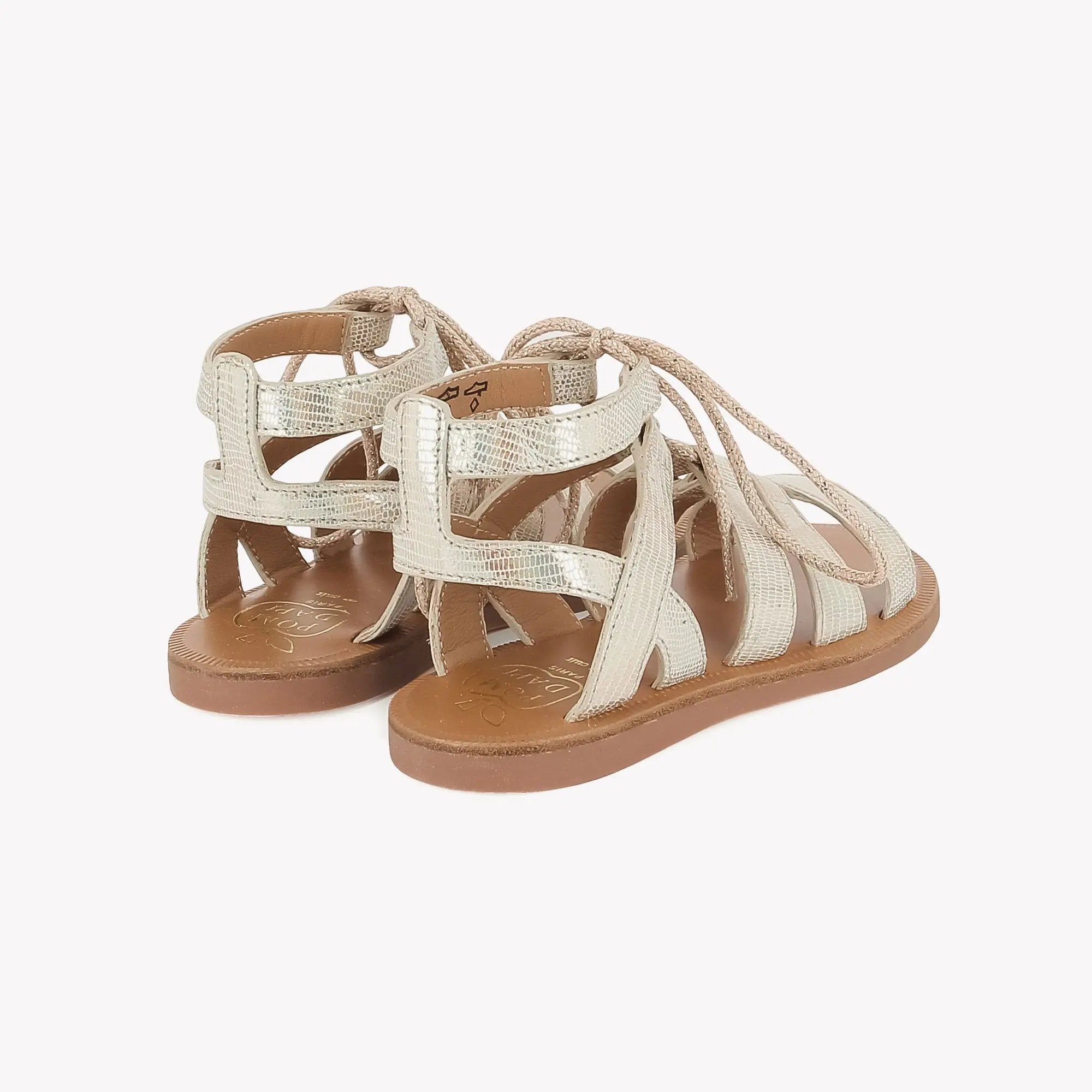 This children's high-top sandal is presented in a platinum metallic leather version. This supple, lightweight shoe is designed with quality materials for proper foot development. Easy to lace up.