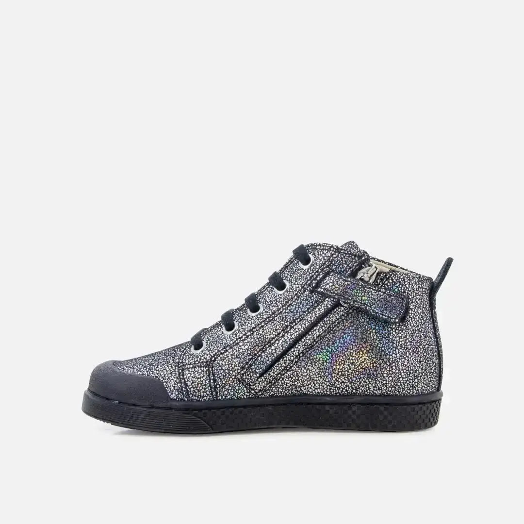 This high-top lace-up children's sneaker is presented in a holographic-effect black smooth leather version. This flexible, hard-wearing shoe is made from quality materials.