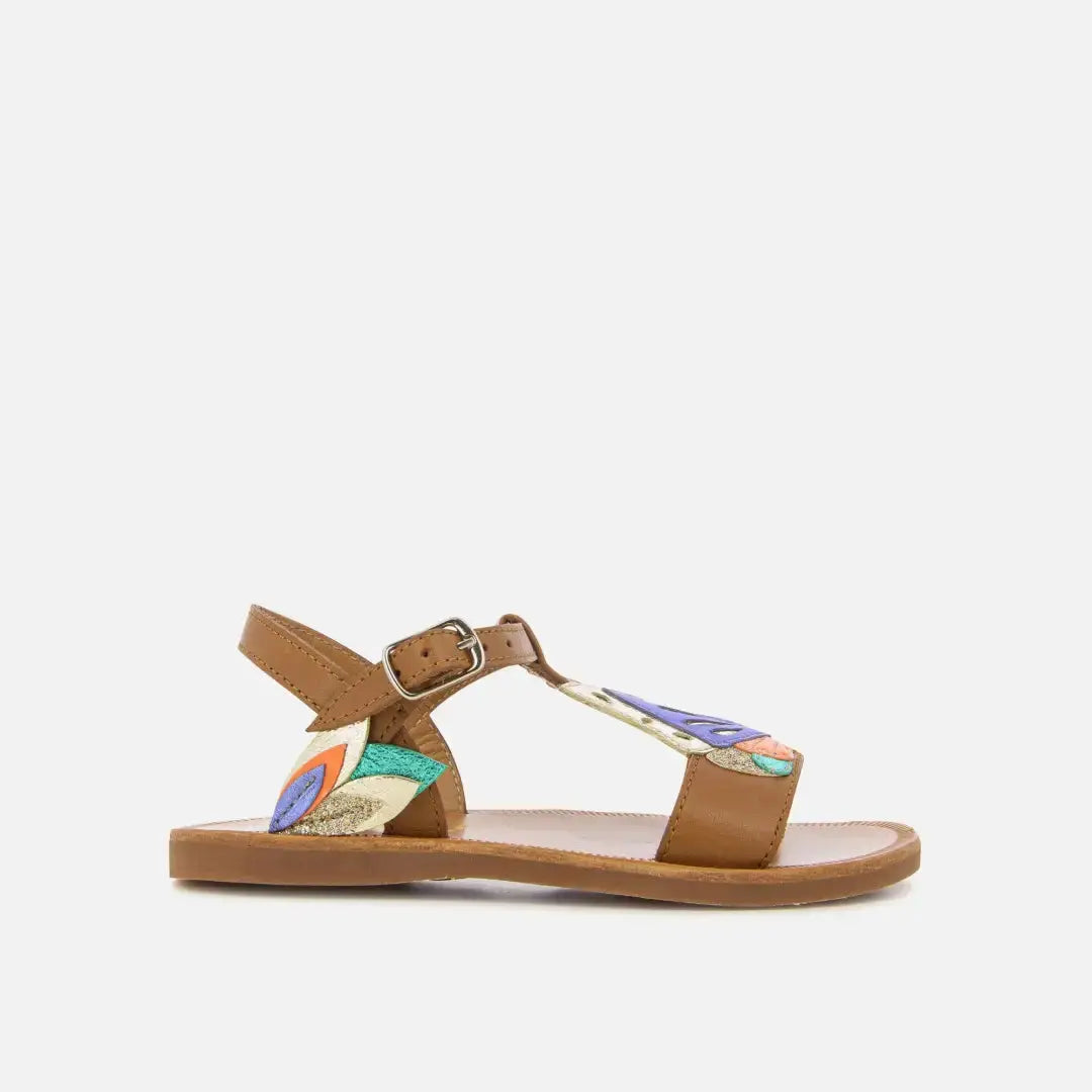Plagette Papillon is a children's sandal presented here in smooth camel leather and multicolored butterfly yoke. Lightweight, with a flexible sole to support the foot, it has a high upper for good ankle support. Easily adjustable thanks to its buckle, it will fit thin feet as well as strong ones.