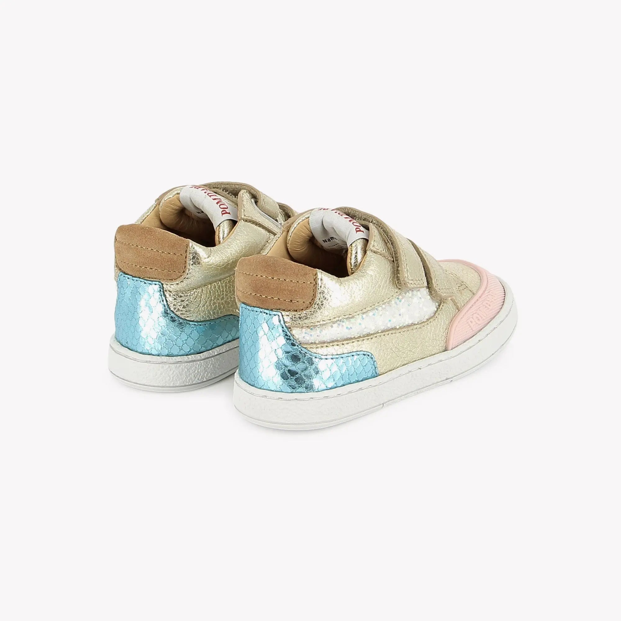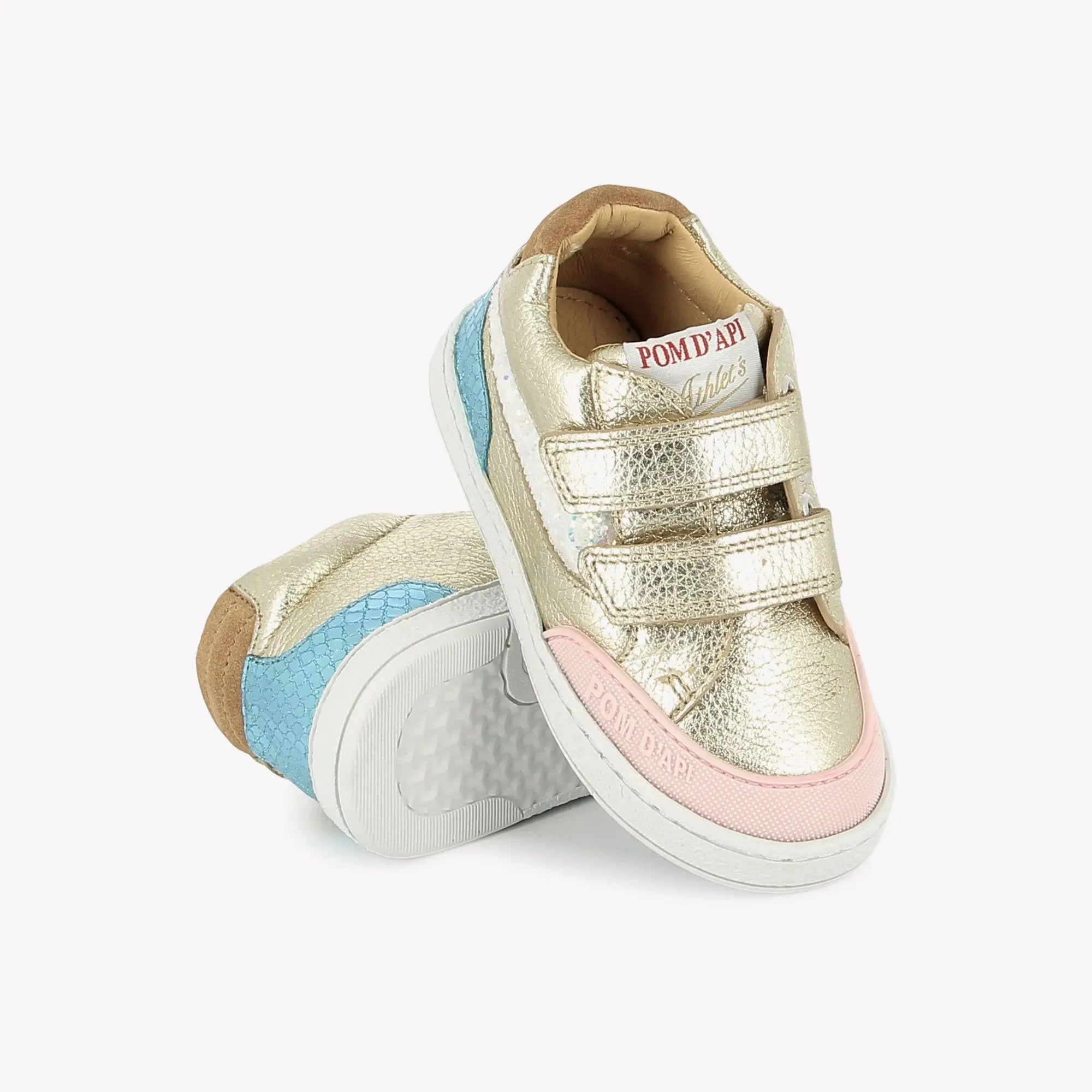 These sneakers from Pom d'Api's Athlet's line stylishly combine colors and leathers. Made entirely of leather, they feature two Velcro straps for easy slip-on and quick adjustment.