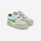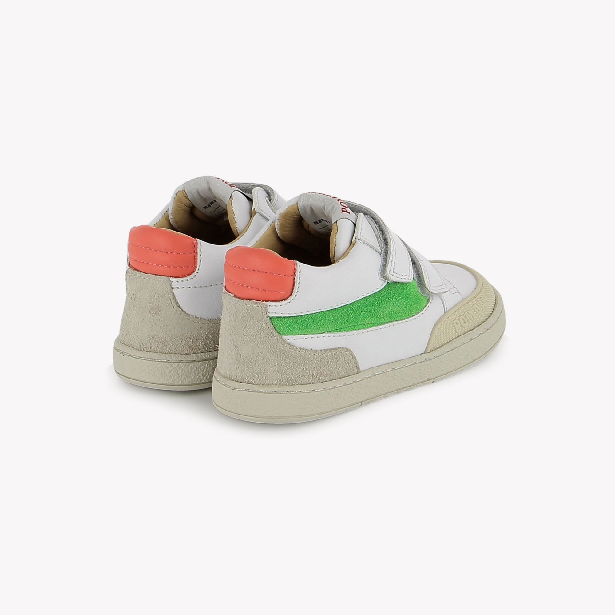These sneakers from Pom d'Api's Athlet's line stylishly combine colors and leathers. Made entirely of leather, they feature two Velcro straps for easy slip-on and quick adjustment.