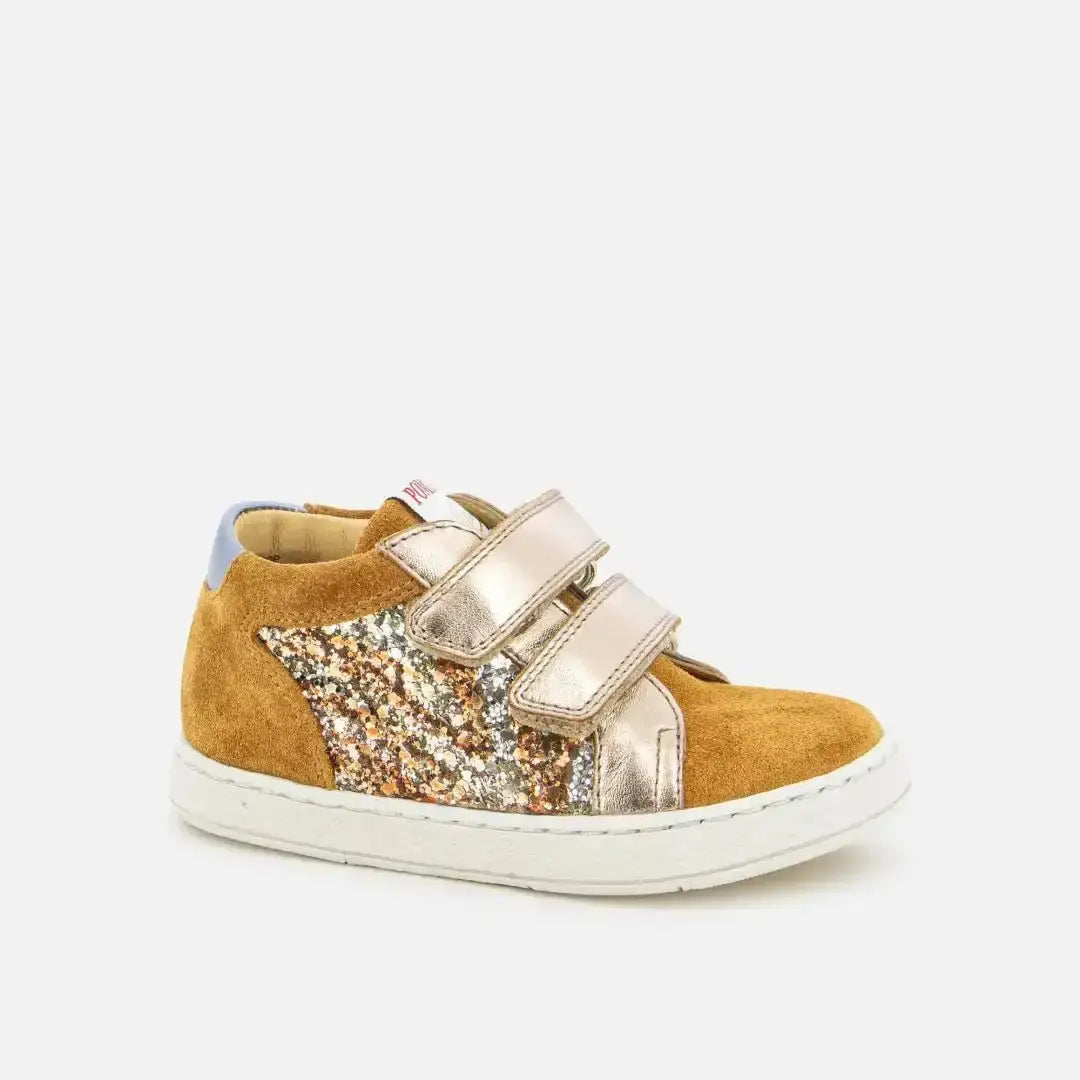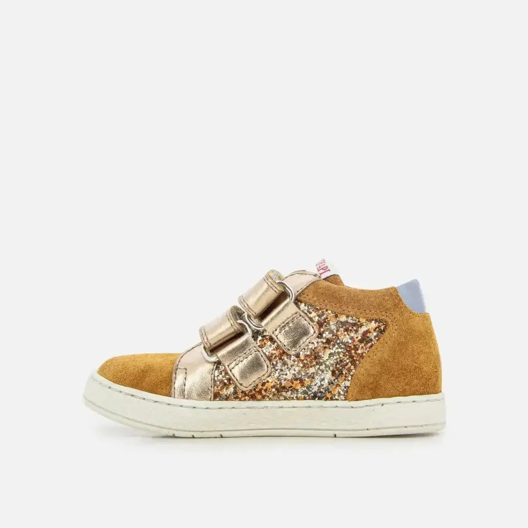 This first-step sneaker is presented in a two-material version in shiny leather and camel velvet, with multicolored sequins. This supple, lightweight shoe is designed with quality materials for proper foot development. Velcro fasteners allow easy adjustment at the ankle and instep.