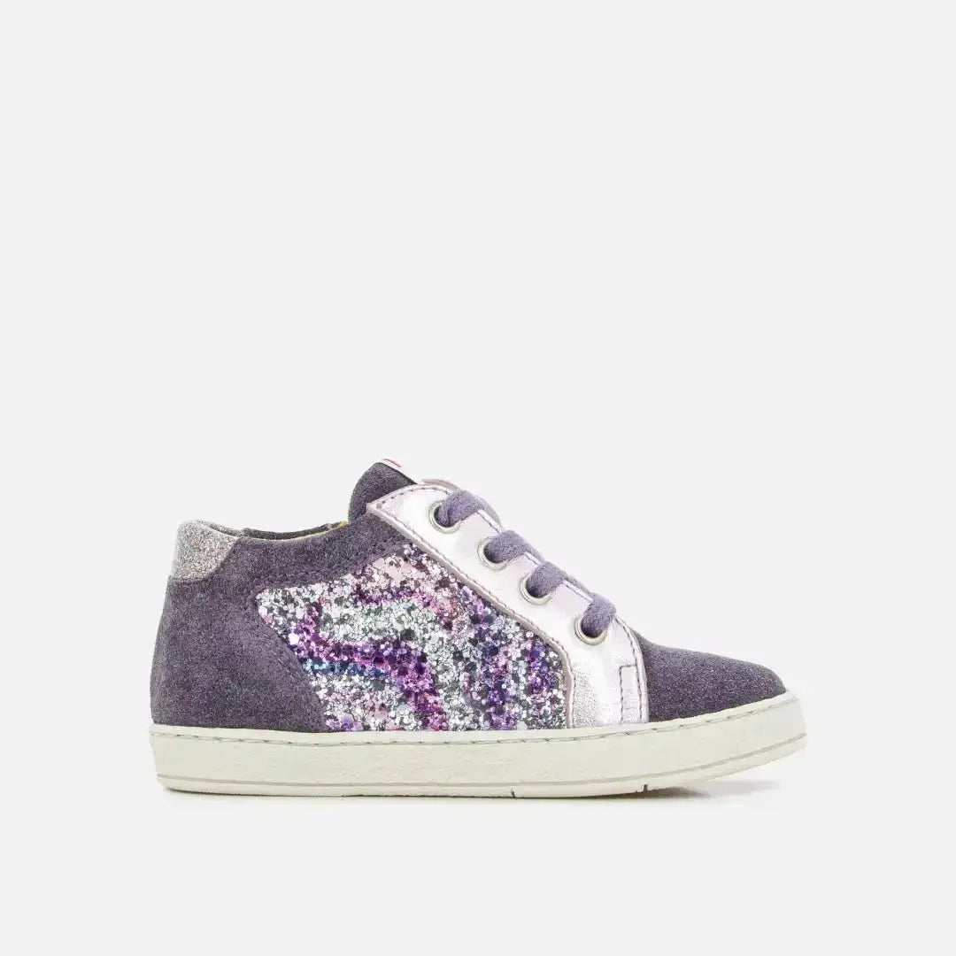This first-step sneaker is presented in a two-material version in shiny silver leather and purple suede leather, with multicolored sequins. This supple, lightweight shoe is designed with quality materials for proper foot development. It adjusts easily at the ankle and instep thanks to its laces and inner zip.