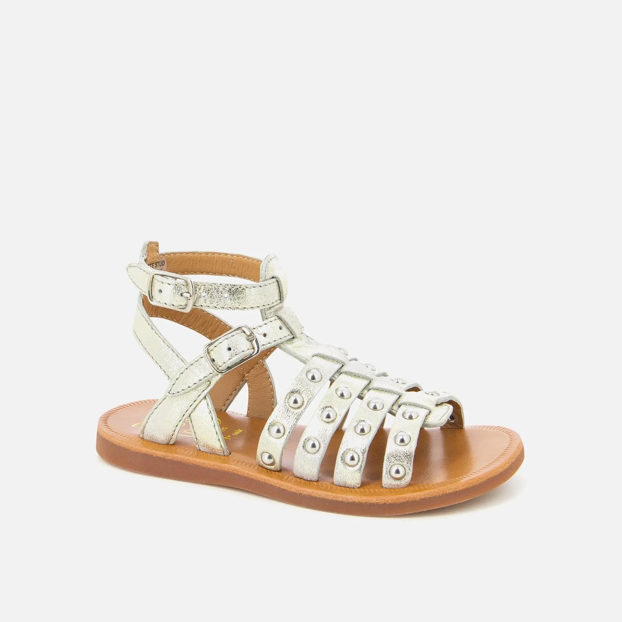 Plagette stud is a strappy children's sandal presented here in iridescent metallic leather. Lightweight, they feature a supple sole to help your foot move smoothly. Easily adjustable thanks to its buckle, it will fit both thin and strong ankles.