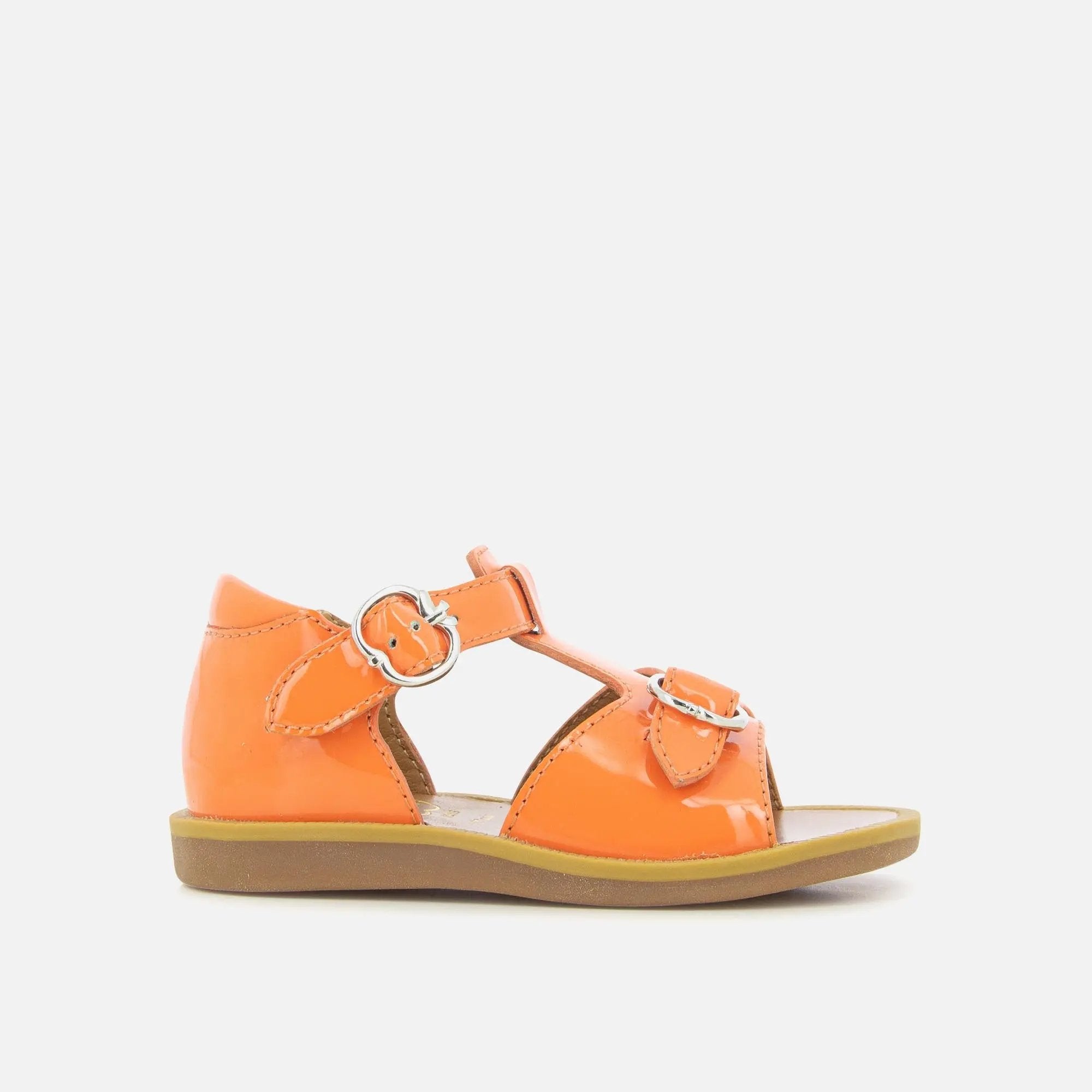 Poppy Bucky is a children's sandal presented here in an orange patent leather version. Lightweight, with a flexible sole to support the foot, it has a high upper for good ankle support. Easily adjustable thanks to its buckle, it will fit both thin and strong ankles.