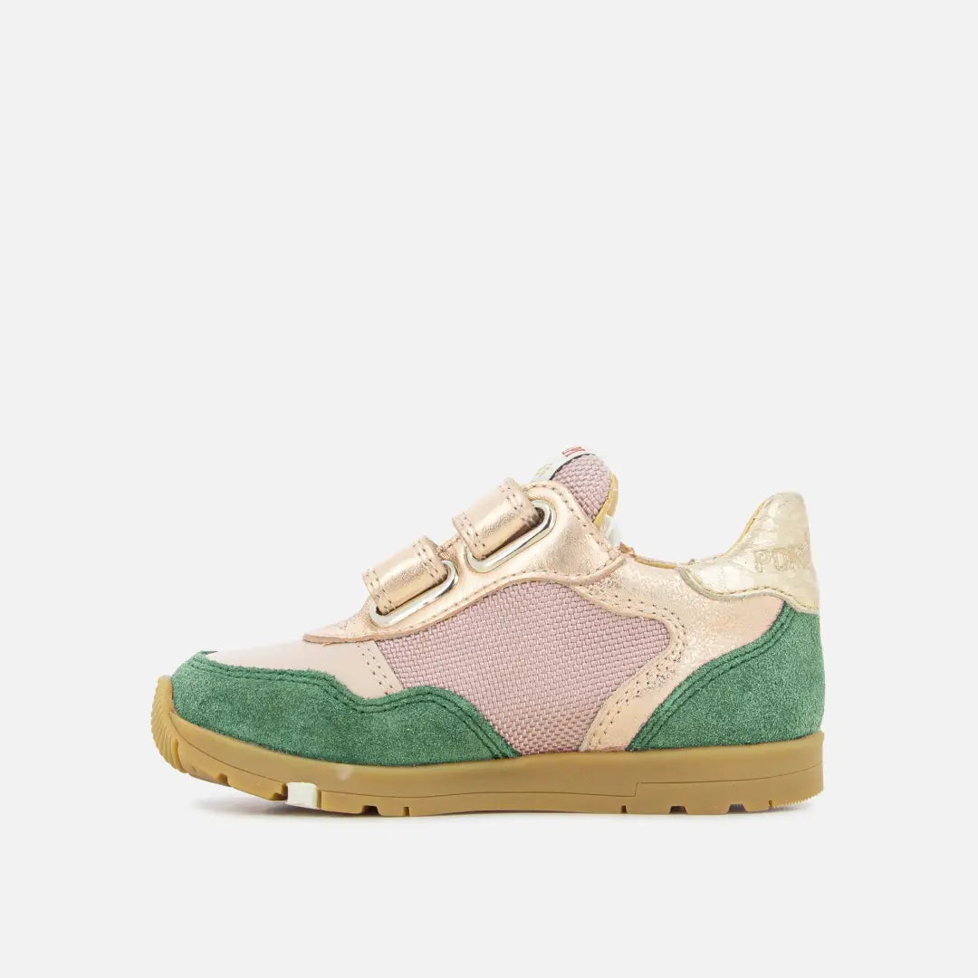 This children's sneaker is presented in a bi-material version in green suede leather and pink textile. This supple, lightweight shoe is designed with quality materials for proper foot development. Velcro fastenings for easy adjustment at the ankle and instep.