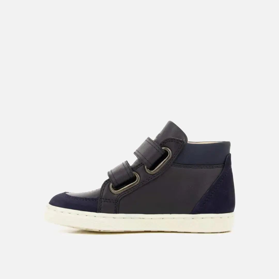 in smooth leather and navy velvet. It's designed with quality materials for proper foot development and is easy to put on thanks to its Velcro fastening.