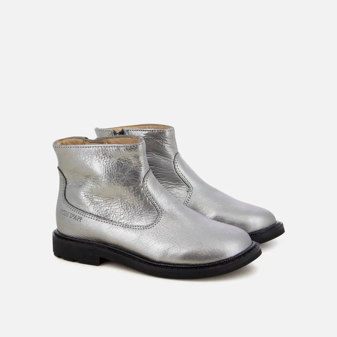 This children's bootie is presented in a silver metallic leather version. Lightweight and supple, they are designed with quality materials to support the development of the foot. This shoe has a high upper for optimum ankle and instep support, and is easy to put on thanks to its inside zip.