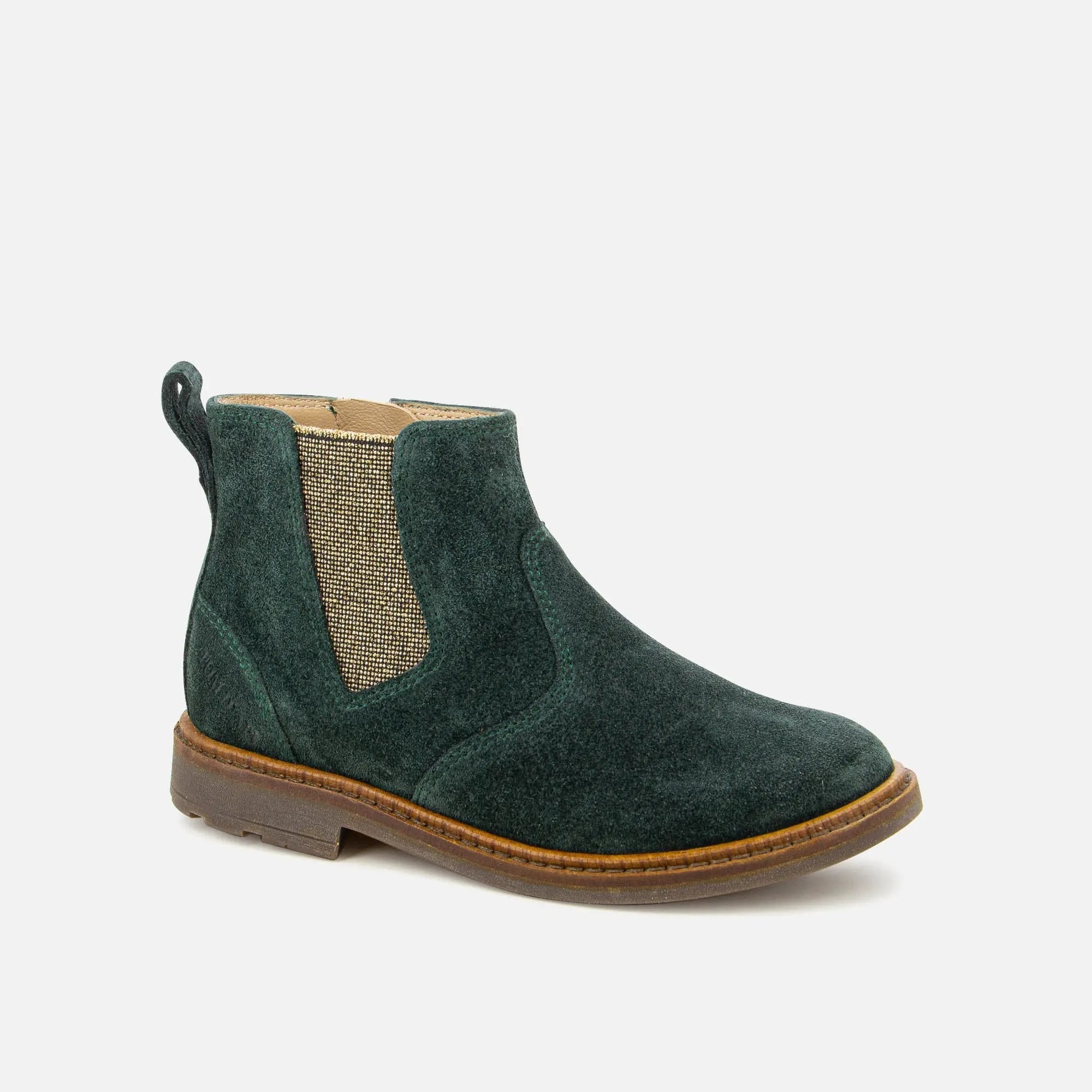 This children's bootie is presented in a fir green suede leather version, with gold elastic. It is light and supple, and designed with quality materials for proper foot development. This shoe has a high shaft for optimum ankle and instep support, and is easy to put on thanks to its inside zip and elastic band.