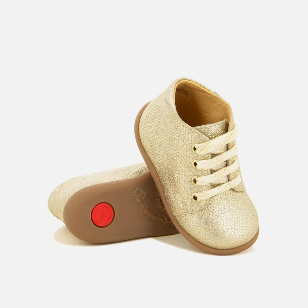 Cette chaussure premiers-pas à lacets pour enfants est présentée dans une version en cuir imprimé métallisé doré. Légère et dotée d'une semelle en caoutchouc, cette chaussure est conçue avec des matériaux de qualité pour le bon développement du pied. Un renfort Anti-Twist placé à l'arrière de la chaussure assure un maintien et une stabilité optimale, tout en offrant une souplesse à l'avant du pied.