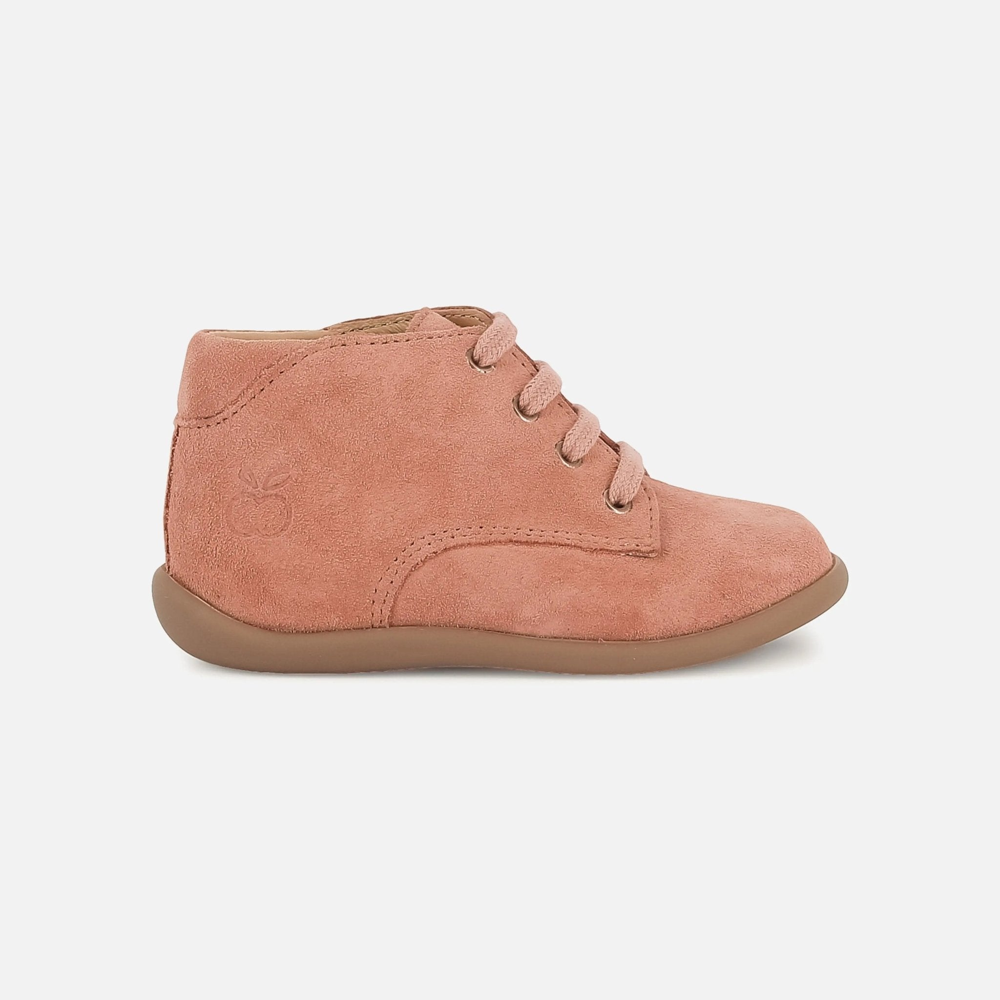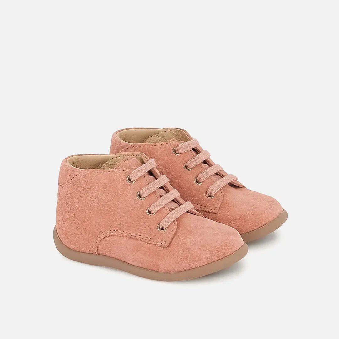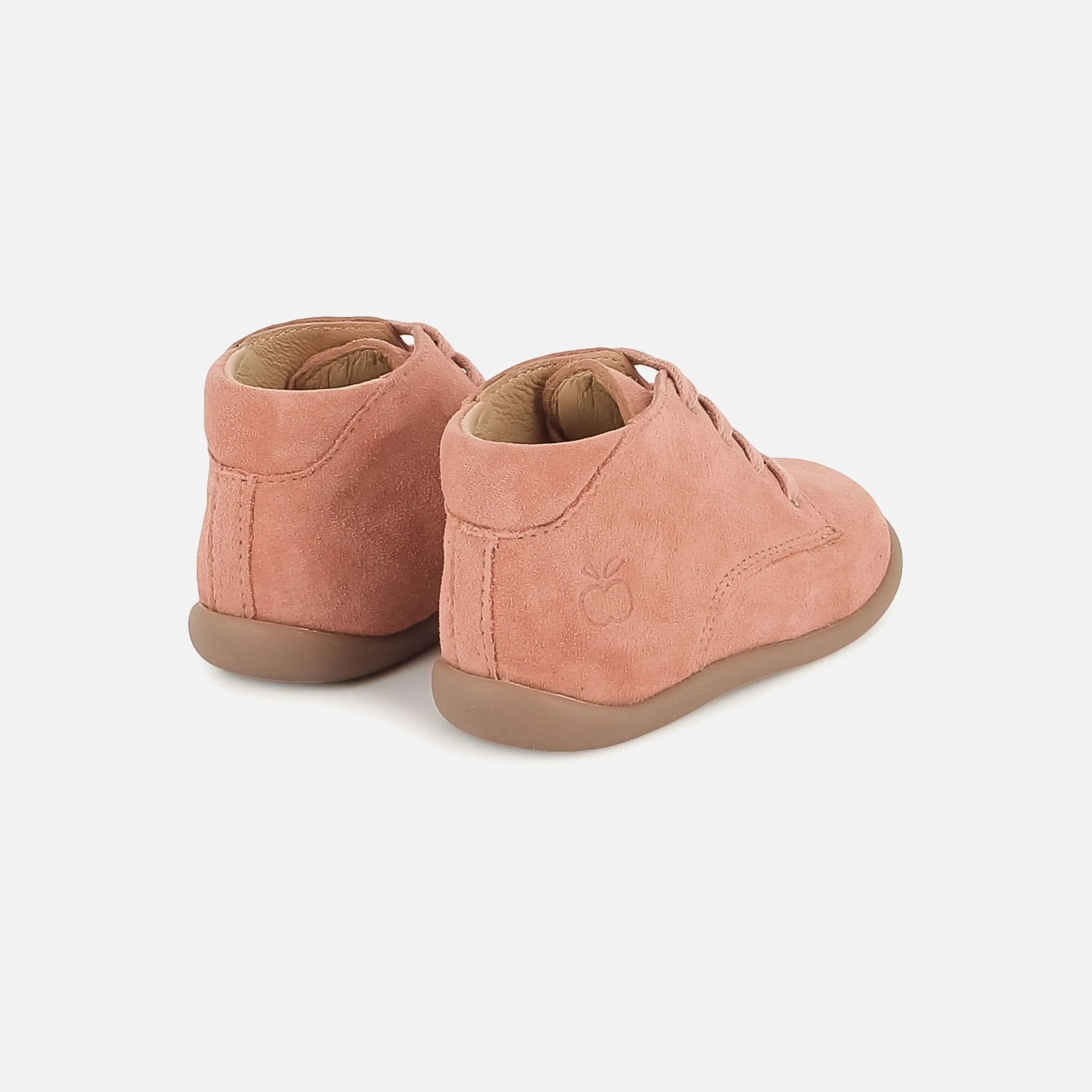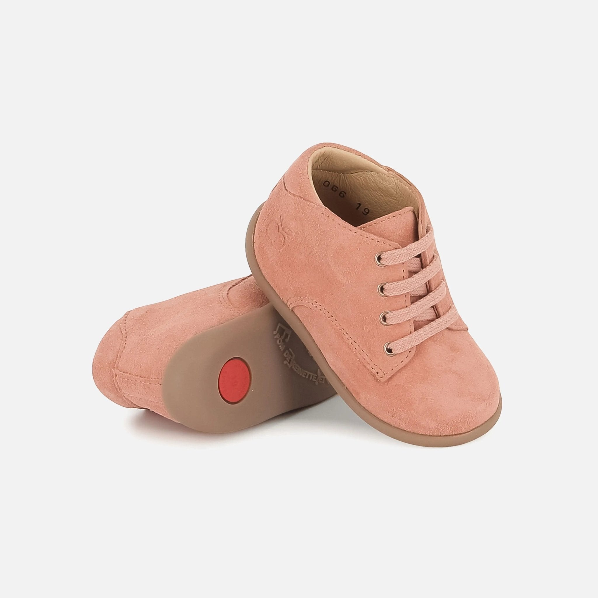 This lace-up first-step shoe for children is presented in a pink suede leather version. Lightweight and equipped with a rubber sole, this shoe is designed with quality materials for proper foot development. An Anti-Twist reinforcement at the back of the shoe provides optimum support and stability, while offering flexibility at the front of the foot.