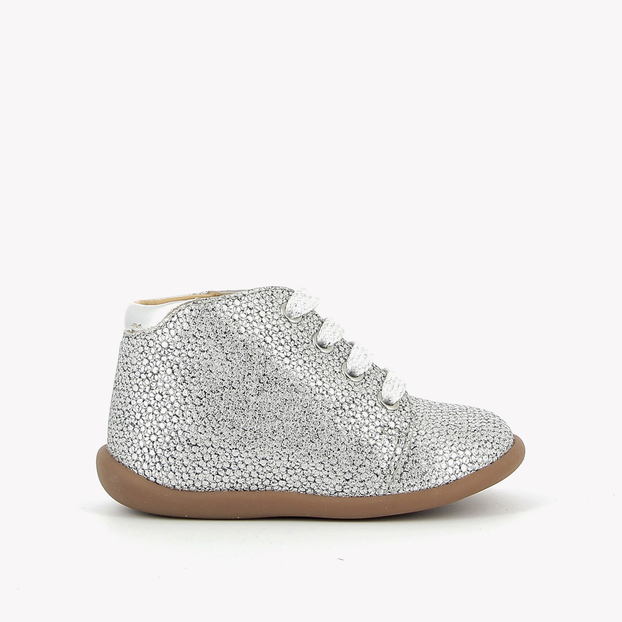This system prevents twisting of the ankle, while maintaining flexibility in the forefoot. Available here in silver and made entirely of leather, this shoe combines elegance and technicality to accompany your first steps. The collar and tongue are padded for added comfort. The lace-up fastening ensures a precise fit, while the wide opening makes them easy to put on.