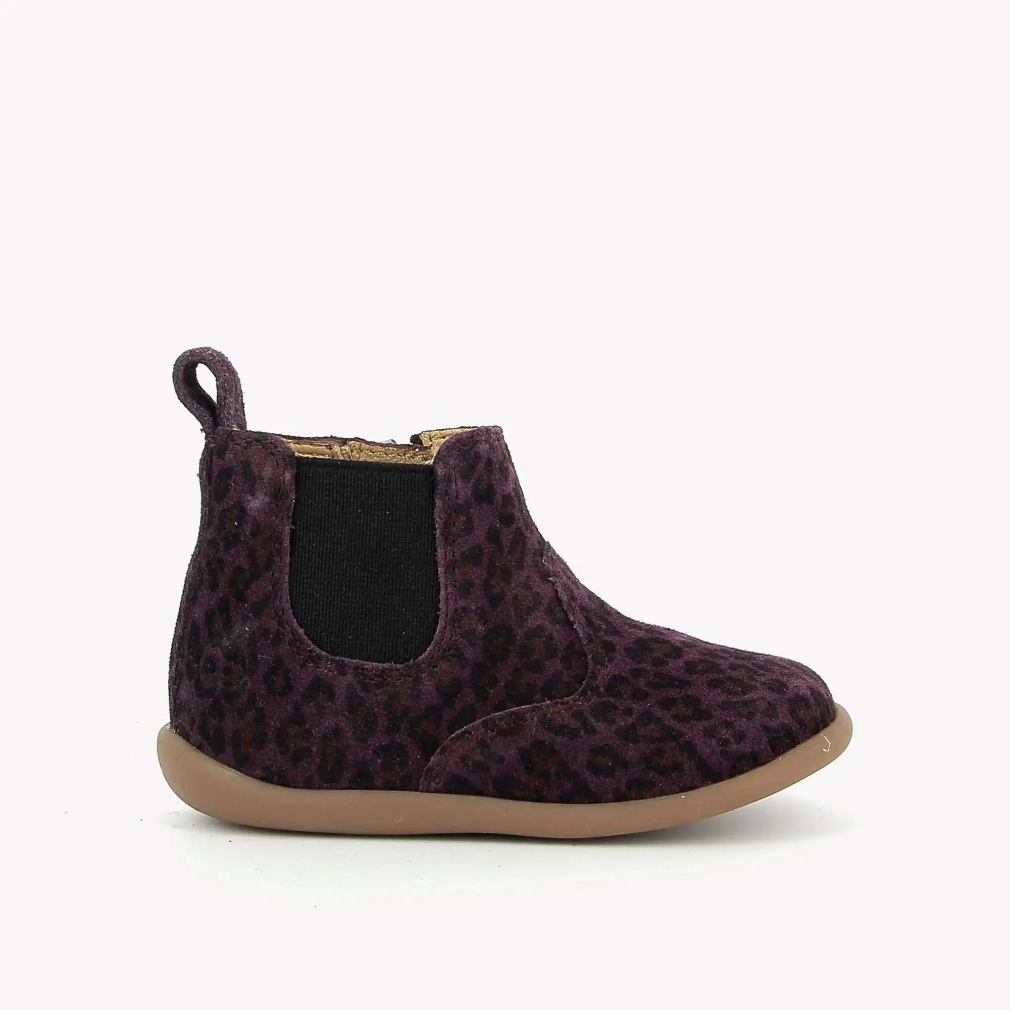 This first-step bootie is presented in leopard-print leather and features an inner zip with elastic for easy slip-on. It features a patented Anti-Twist© shank integrated into the sole at heel level.