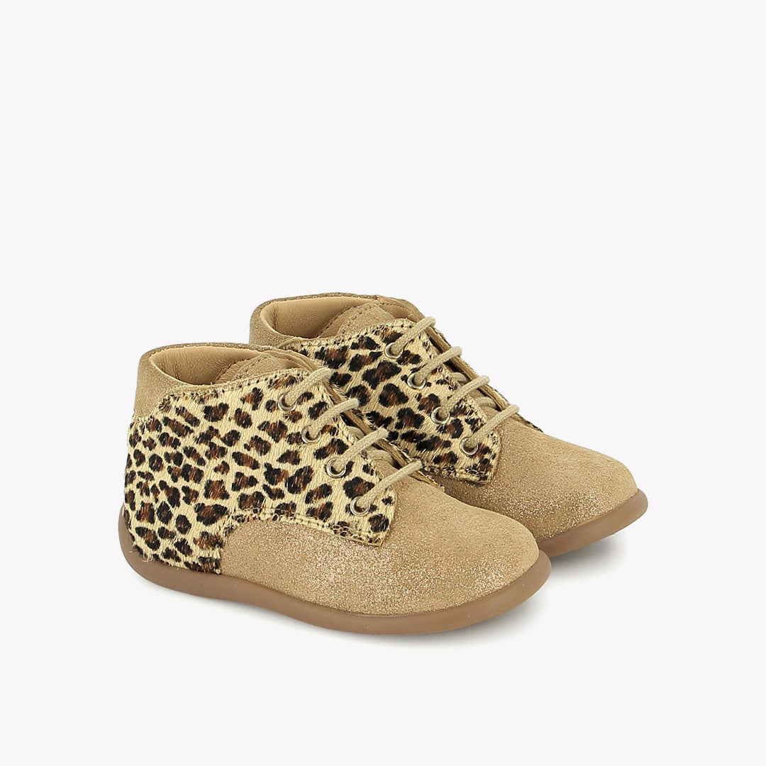 Crafted in gold suede and furry fancy leather, this model combines elegance and technicality to accompany your first steps. The collar and tongue are padded for added comfort. The lace-up fastening ensures a precise fit, while the wide opening makes them easy to put on.